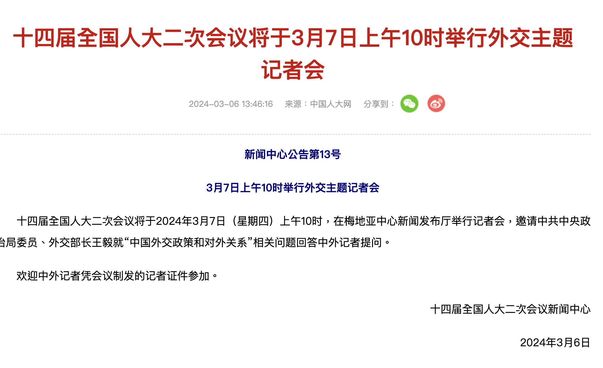 十四屆全國人大二次會議將於2024年3月7日(星期四)上午10時,在梅地亞中心新聞發布廳舉行記者會,邀請中共中央政治局委員、外交部長王毅就“中國外交政策和對外關係”相關問題回答中外記者提問。
