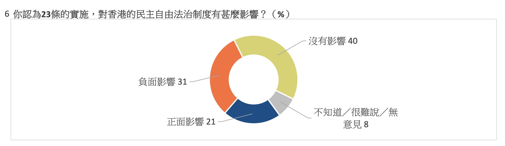 對於香港的民主自由法治制度,合共六成一受訪者對此認為有“正面影響”(21%)及“沒有影響”(40%),表示“負面影響”的佔三成一,“不知道/很難說/無意見”則佔百分之八。