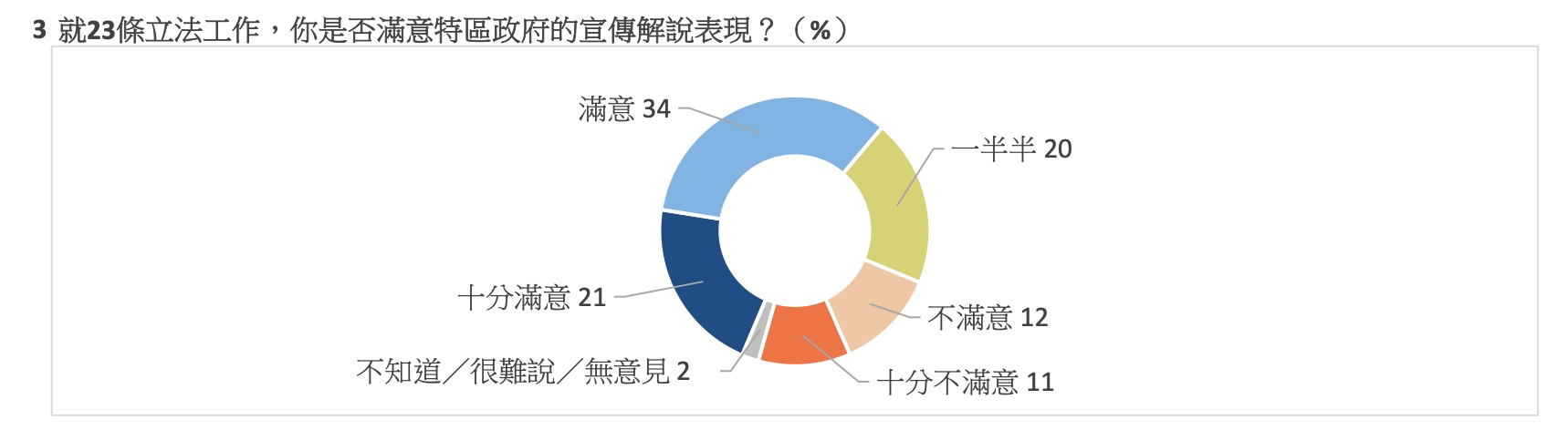調查亦發現,對特區政府於維護國家安全條例立法工作中的宣傳解說表現,合共五成半受訪者表示“十分滿意”及“滿意”,表示“一半半”的佔兩成,表示“十分不滿意”及“不滿意”的共佔兩成三,而表示“不知道/很難說/無意見”則佔百分之二。