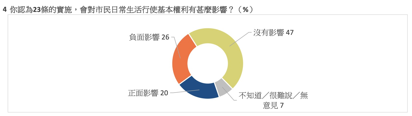 調查發現,合共六成七受訪者表示維護國家安全條例實施對市民日常生活行使基本權利有“正面影響”(20%)及“沒有影響”(47%),表示有“負面影響”的佔兩成六,“不知道/很難說/無意見”則佔百分之七。