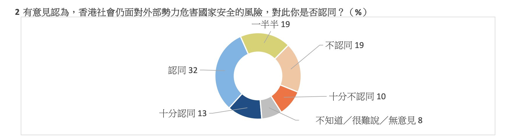 調查問及是否認同香港社會仍面對外部勢力危害國家安全的風險,合共四成半受訪者對此表示“十分認同”及“認同”,表示“一半半”的佔一成九,“十分不認同”及“不認同”的則共佔兩成九,而表示“不知道/很難說/無意見”的佔百分之八。