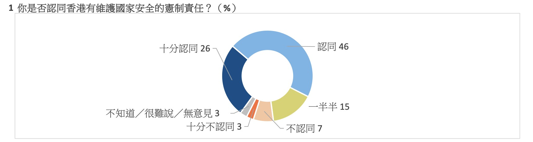 合共七成二受訪者表示“十分認同”及“認同”香港有維護國家安全的憲制責任,表示“一半半”的佔一成半,“十分不認同”及“不認同”的則共佔一成,而表示“不知道/很難說/無意見”的佔百分之三。