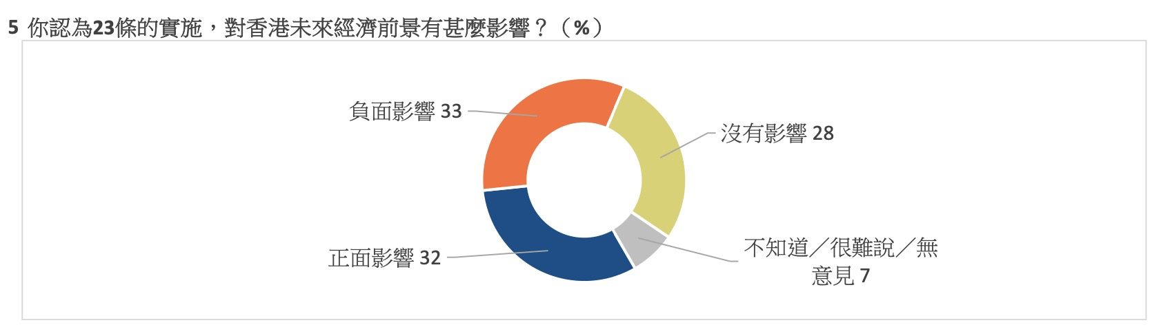 至於對香港未來經濟前景,同樣有六成受訪者認為有“正面影響”(32%)及“沒有影響”(28%),表示“負面影響”的佔三成三,“不知道/很難說/無意見”則佔百分之七。以上結果顯示多數市民認為維護國家安全條例立法無損港人權利自由,以及香港的前景。