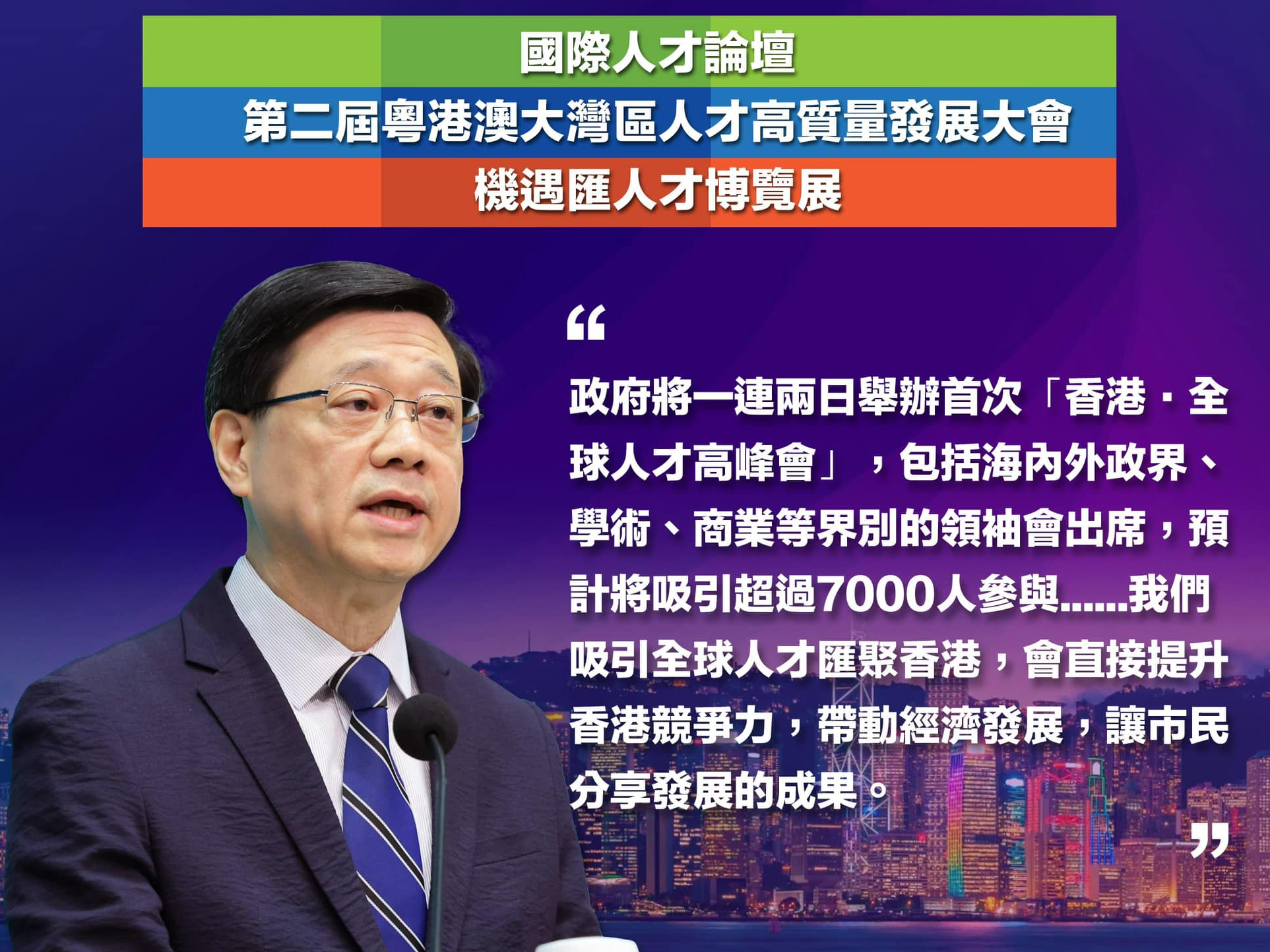 李家超指,上任之後,推出了多項“搶人才”計劃,包括“高才通計劃”,優化“一般就業政策”、“輸入內地人才計劃”、“科技人才入境計劃”等等,亦取消了“優才計劃”的配額。截至今年三月底,已有約11萬位人才經各人才計劃來到香港。其中,高才通共收到約77,000宗申請,約62,000宗已獲批。特區政府估算高才通計劃每年可以為香港帶來約340億直接經濟貢獻,相當於本地生產總值約1.2%。吸引全球人才匯聚香港,會直接提升香港競爭力,帶動經濟發展,讓市民分享發展的成果。