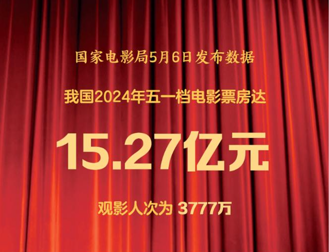 國家電影局5月6日發布數據,我國2024年五一檔電影票房達15.27億元,觀影人次為3777萬。