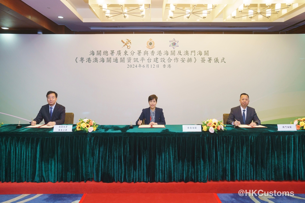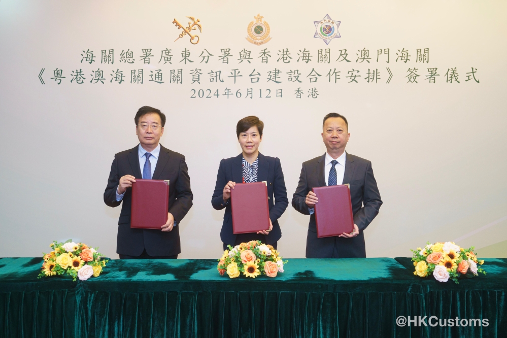 香港海關關長何珮珊與國家海關總署廣東分署主任李魁文及澳門海關關長黃文忠於六月十二日在香港簽署《粵港澳海關通關資訊平台建設合作安排》,正式展開構建資訊平台的工作。