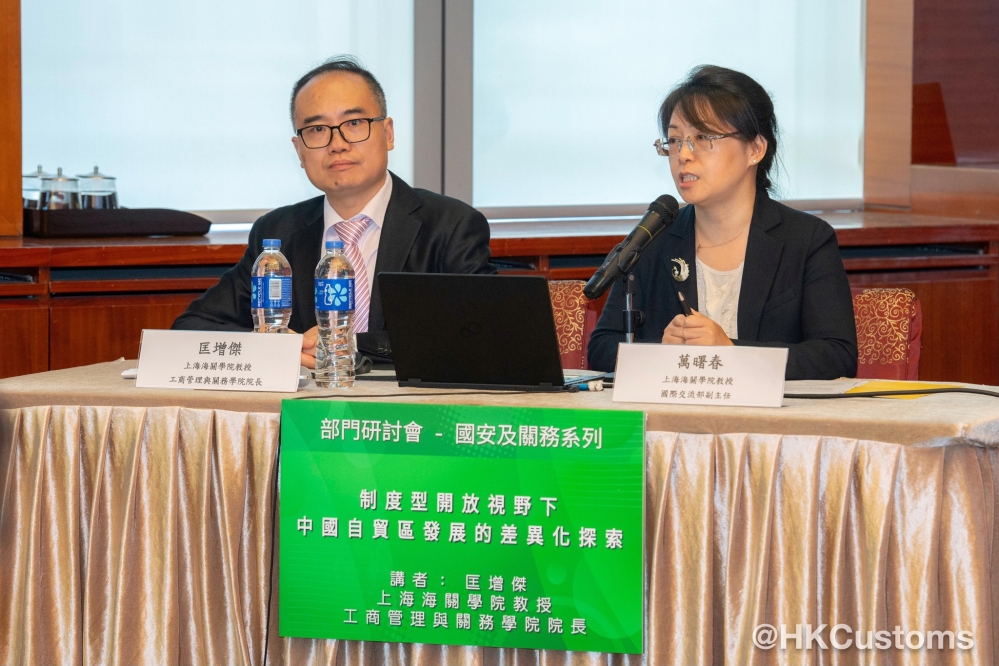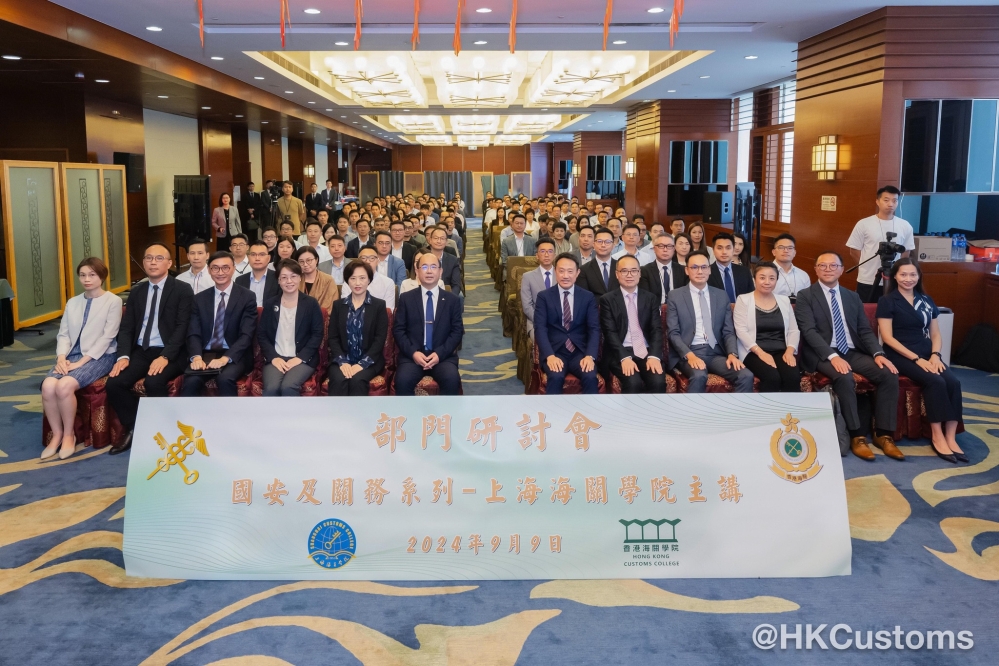 香港海關持續致力做好「護法守關」的角色,更是維護國家安全重要一員,一直致力提升人員對總體國家安全觀、國安法、海關在維護國家安全工作及關務的認識。香港海關於九月九日舉行「國安及關務系列」部門研討會,邀請上海海關學院工商管理與關務學院院長匡增傑及上海海關學院國際交流部副主任萬曙春分别講解海關法以及中國自貿區。研討會共有近二百位海關管理層人員出席。