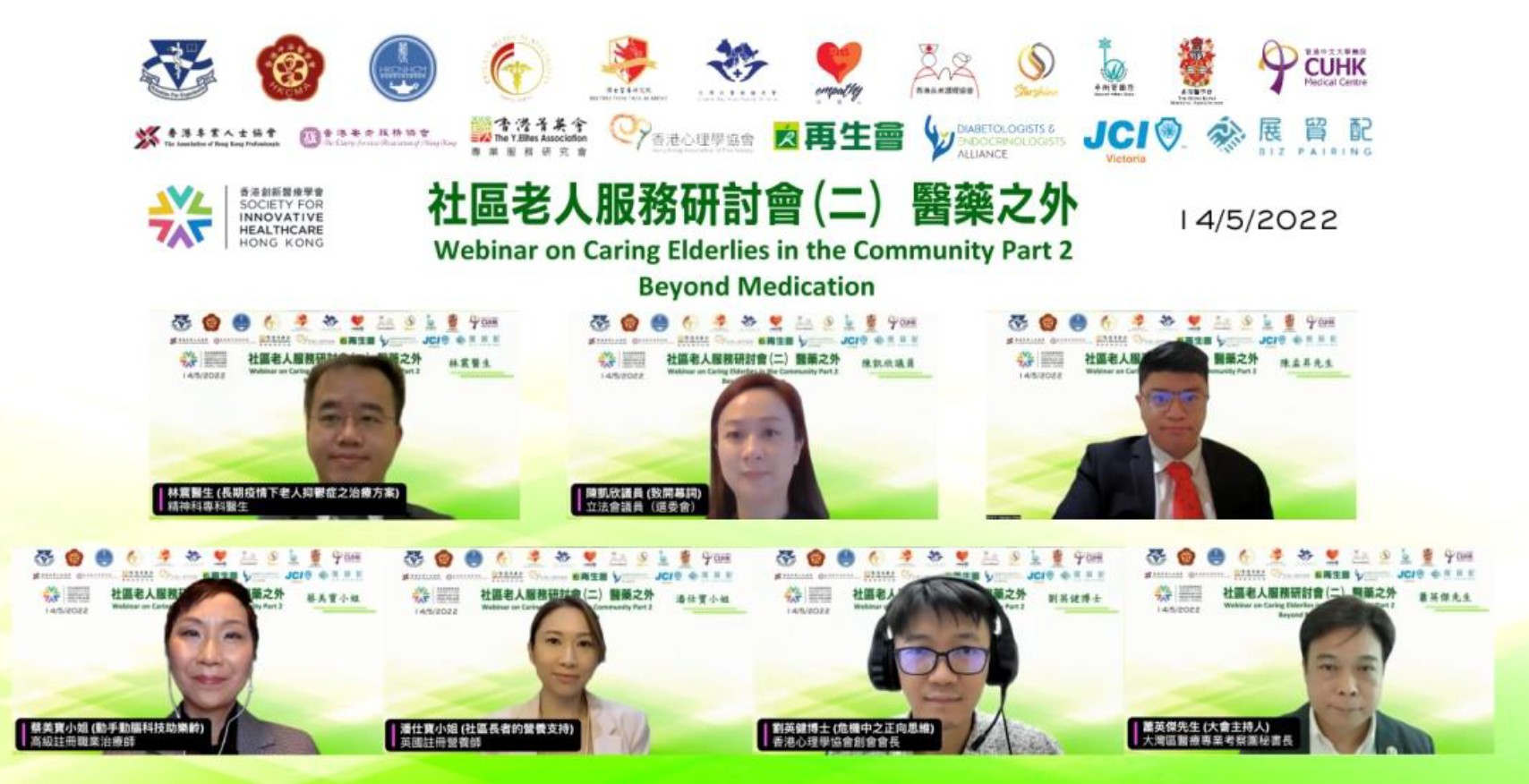 香港創新醫療學會於2022年5月14日舉辦社區老人服務研討會(二)“醫藥以外”,經已順利完成。研討會請來精神科專科醫生、註冊營養師、註冊高級職業治療師,以及心理學協會主席分享如何令長者得到心、身、靈全方位照顧,能在社區安享晚年。