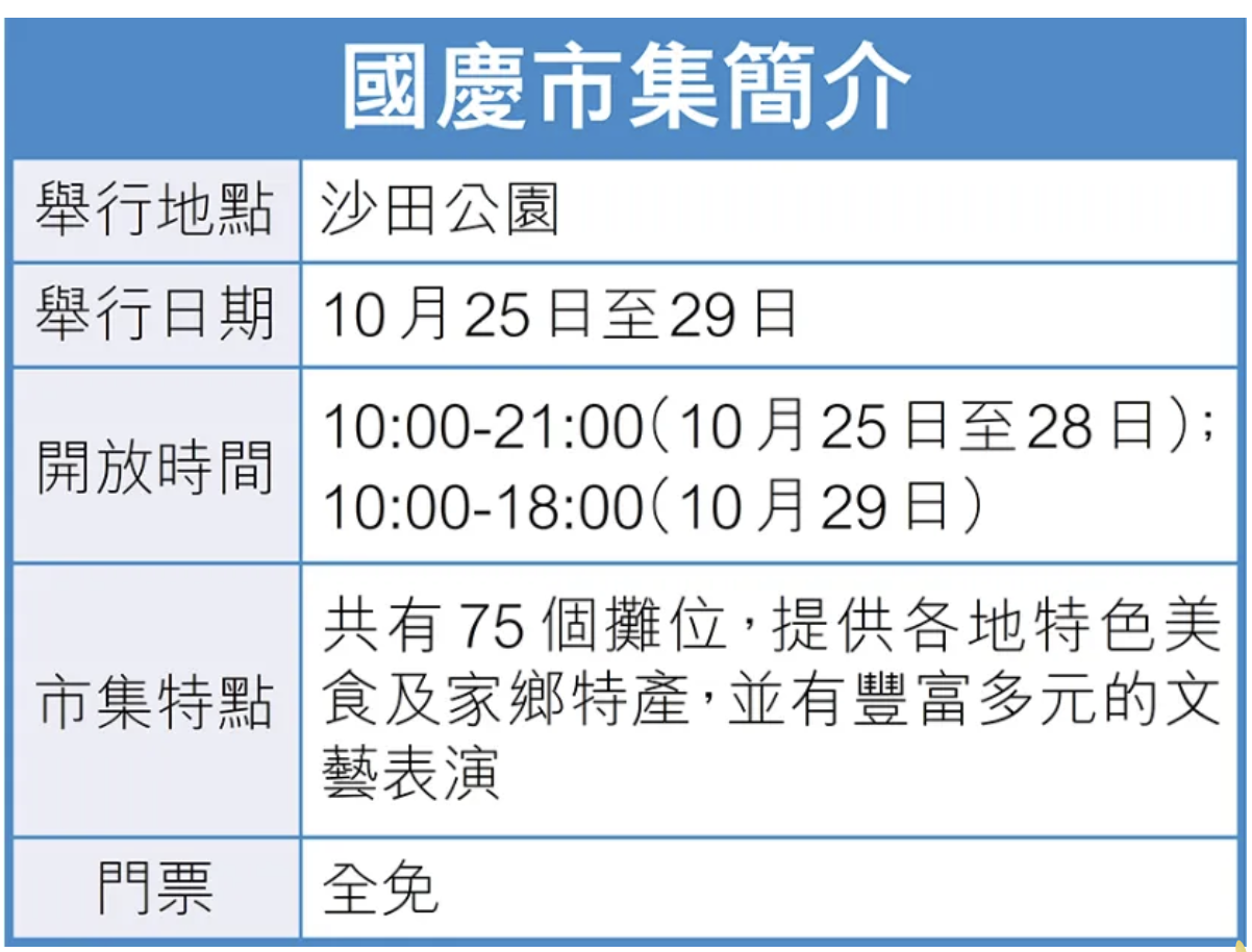 慶祝中華人民共和國成立75周年市集於10月25日至29日在香港沙田公園舉辦。市集匯聚28個省級同鄉社團,為期5天,設有75個攤檔,向市民遊客免費開放,展示內地各省份獨特的飲食和風俗文化。