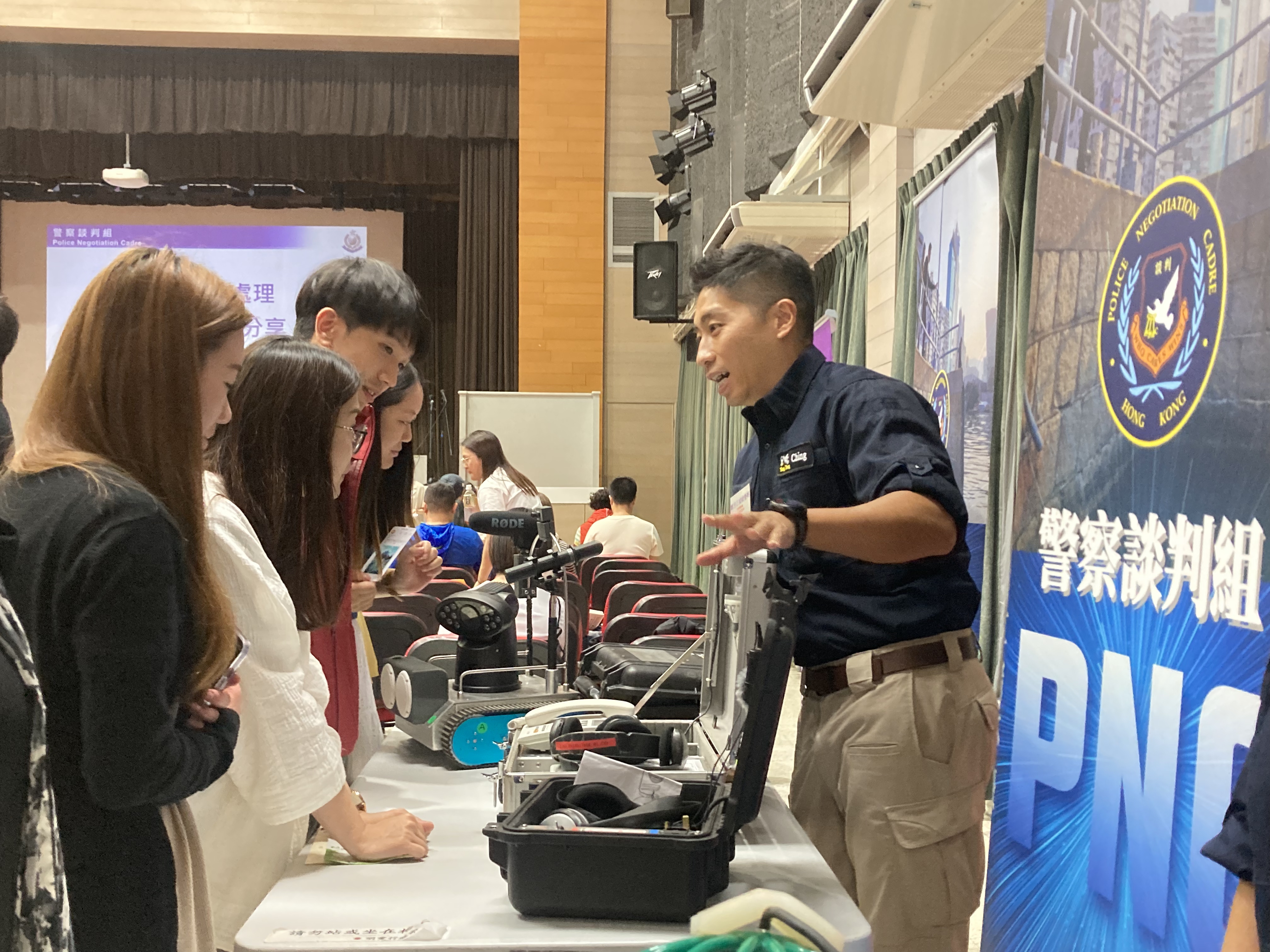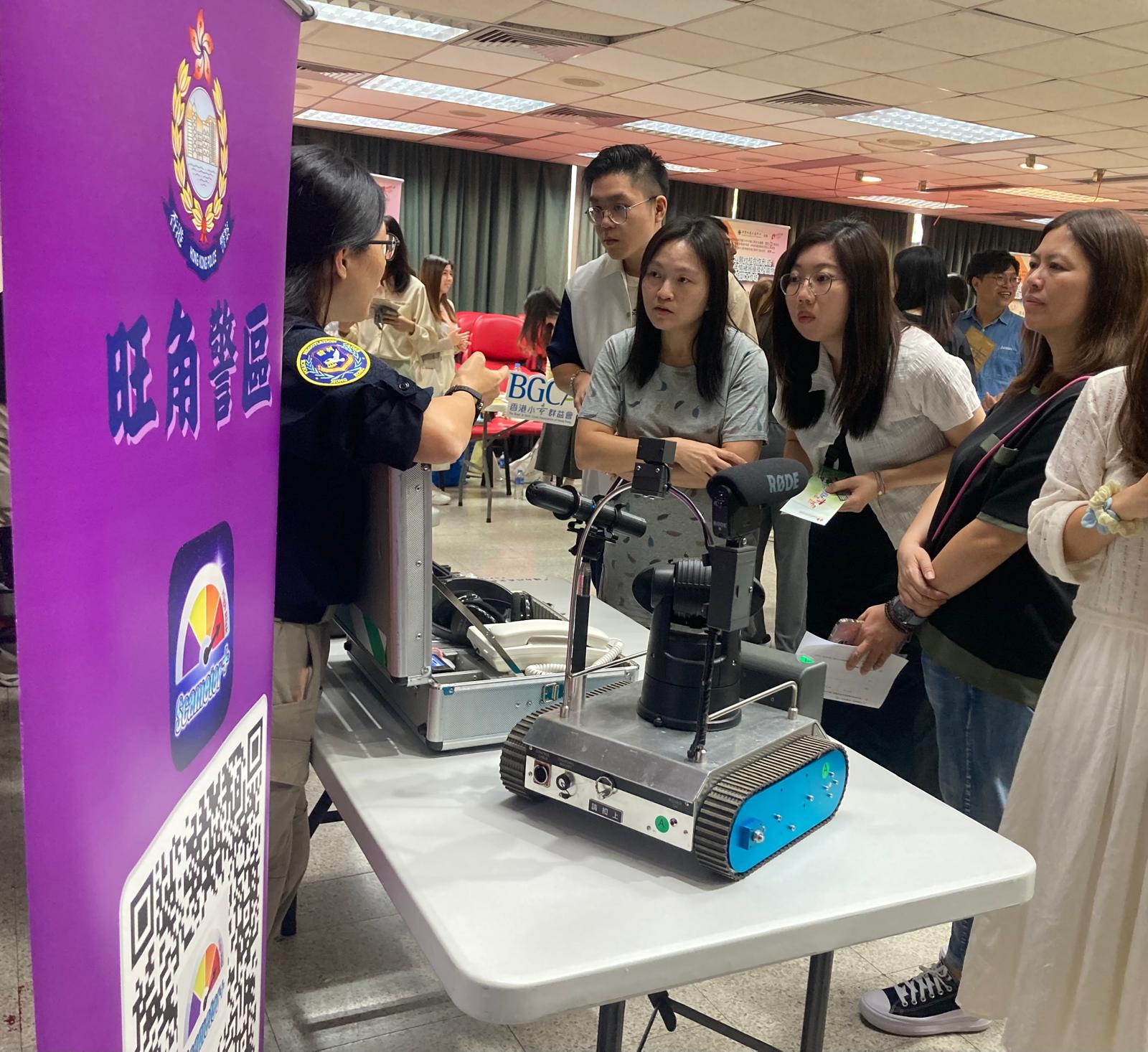 會場設置多個服務攤位,包括旺角警區防騙宣傳、警察談判組講解出勤的特別裝備和儀器及各非牟利機構介紹支援青少年精神健康的服務。