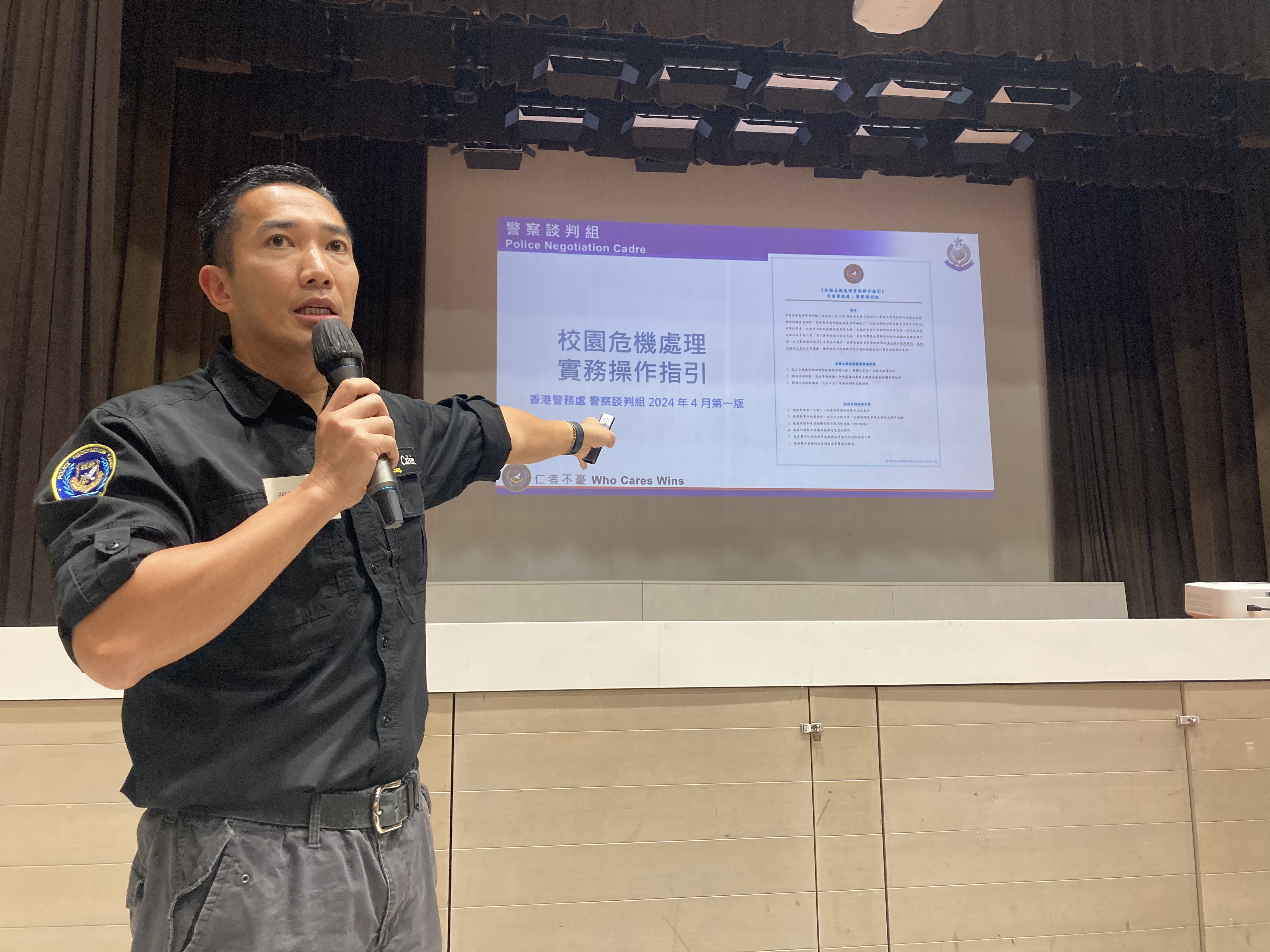 由旺角警區指揮官暨警察談判組副主管吳志忠總警司及警察談判組總訓練主任張健斌警司分享警察到場前即時介入危機的技巧和心態、如何防止危機惡化和談判技巧,強調聆聽技巧及團隊合作對處理青少年自殺危機的重要性。