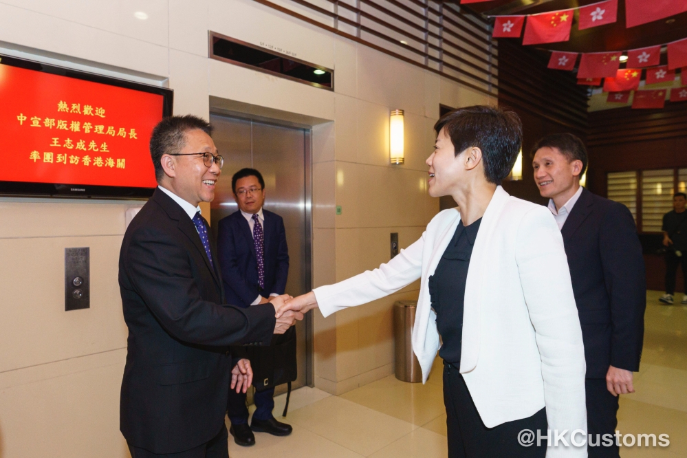 海關關長何珮珊十月十四日在海關總部大樓歡迎中宣部版權管理局局長王志成率領代表團到訪香港海關。會晤其間,雙方回顧近年保護知識產權的合作成果,並展望未來的部署及策略。為了深化打擊侵權活動的合作,雙方同意加强信息互換及人員交流培訓。