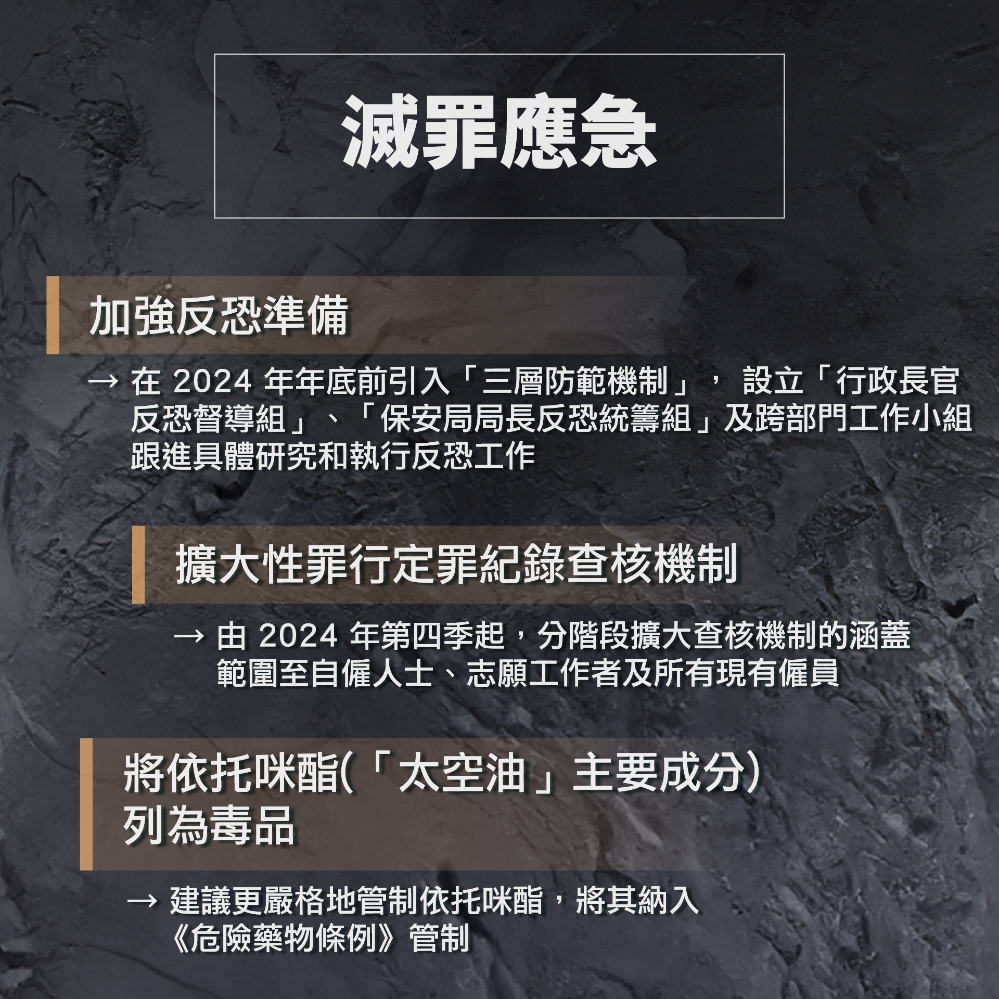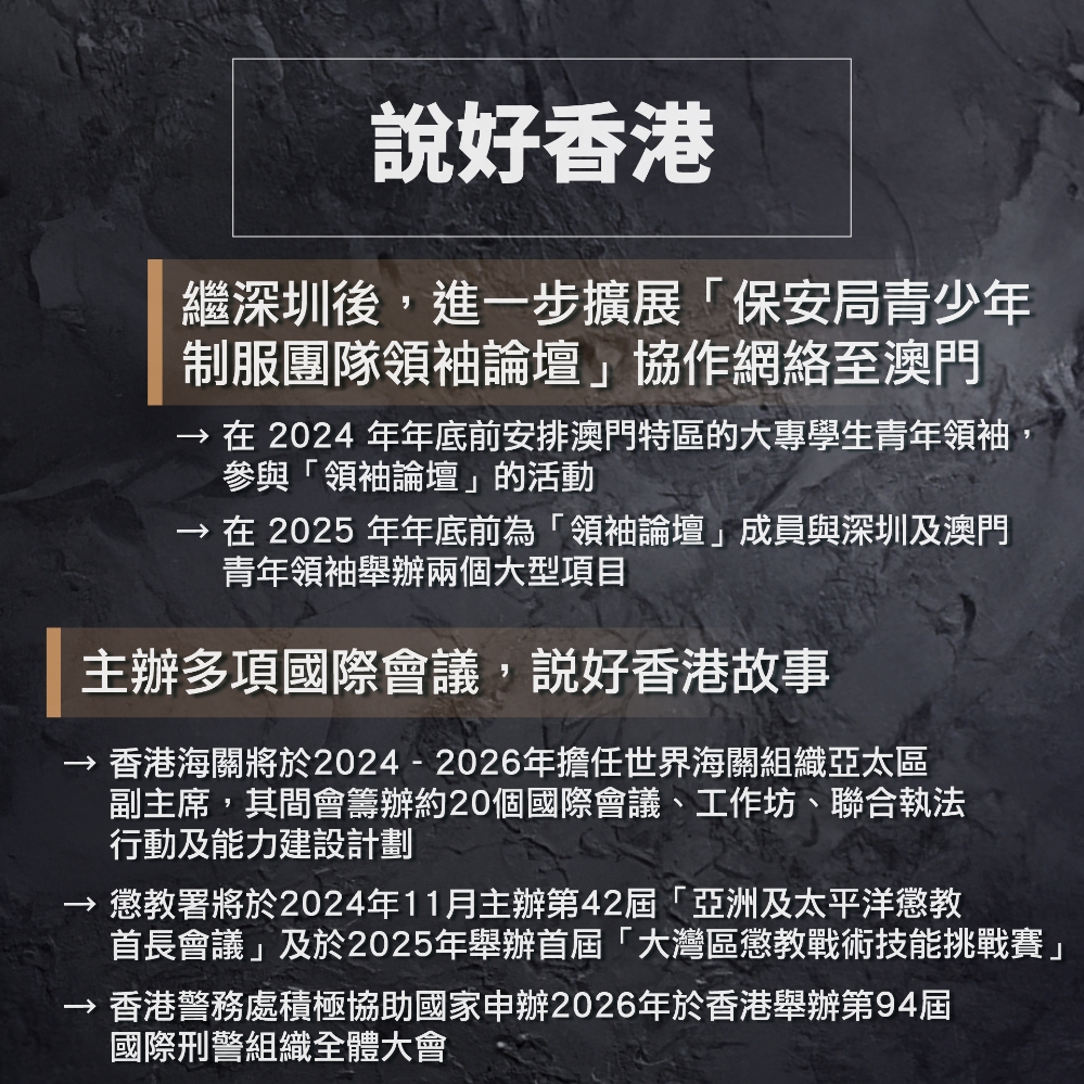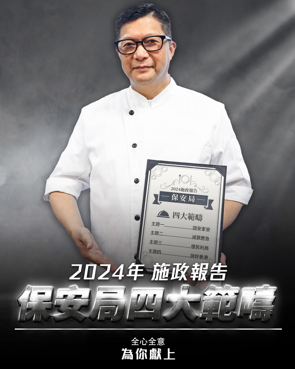 全心全意,施政為民,就好像主廚帶領整個團隊,用心為顧客製作菜餚,令每位食客感到幸福。過去幾個月,鄧炳強與團隊將保安局2024的施政重點劃分為四大範疇 - 國安家安、滅罪應急、便民利商、說好香港,為市民增添幸福感。