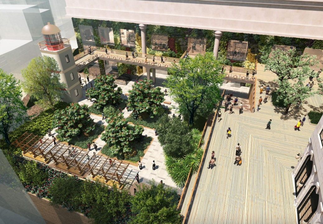 另外,商場毗鄰日月星街、藍屋一帶舊式建築物及活化項目利東街等,料成為近年大熱旅遊方式City Walk的目的地,為此,商場另設6萬平方呎綠化公園,連貫半山堅尼地道、日月星街及皇后大道東,並提供無障礙通道及兒童康樂設施,供市民欣賞戶外學習。