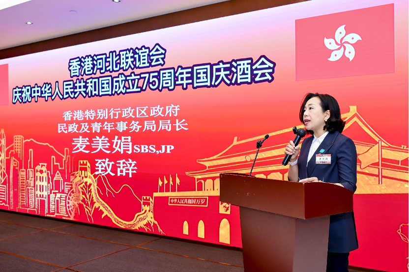 民政及青年事務局局長麥美娟在致辭中表示,自新中國成立以來,中華民族取得舉世矚目的成就,成為國際公認的強國。河北是京津冀經濟圈的重要組成部分,香港則是國際金融中心,儘管兩地相隔千里,但一直保持良好合作關係,雙方在金融、貿易和專業服務等領域有優勢。香港河北聯誼會自2002年成立以來,一直秉持愛國、愛港、愛家鄉的精神,團結在港鄉親,推動冀港兩地在經貿、文化、教育等領域的交流合作。展望未來,民青局願意繼續支持香港河北聯誼會的各項會務工作,共同推動冀港兩地的全方位交流與合作。