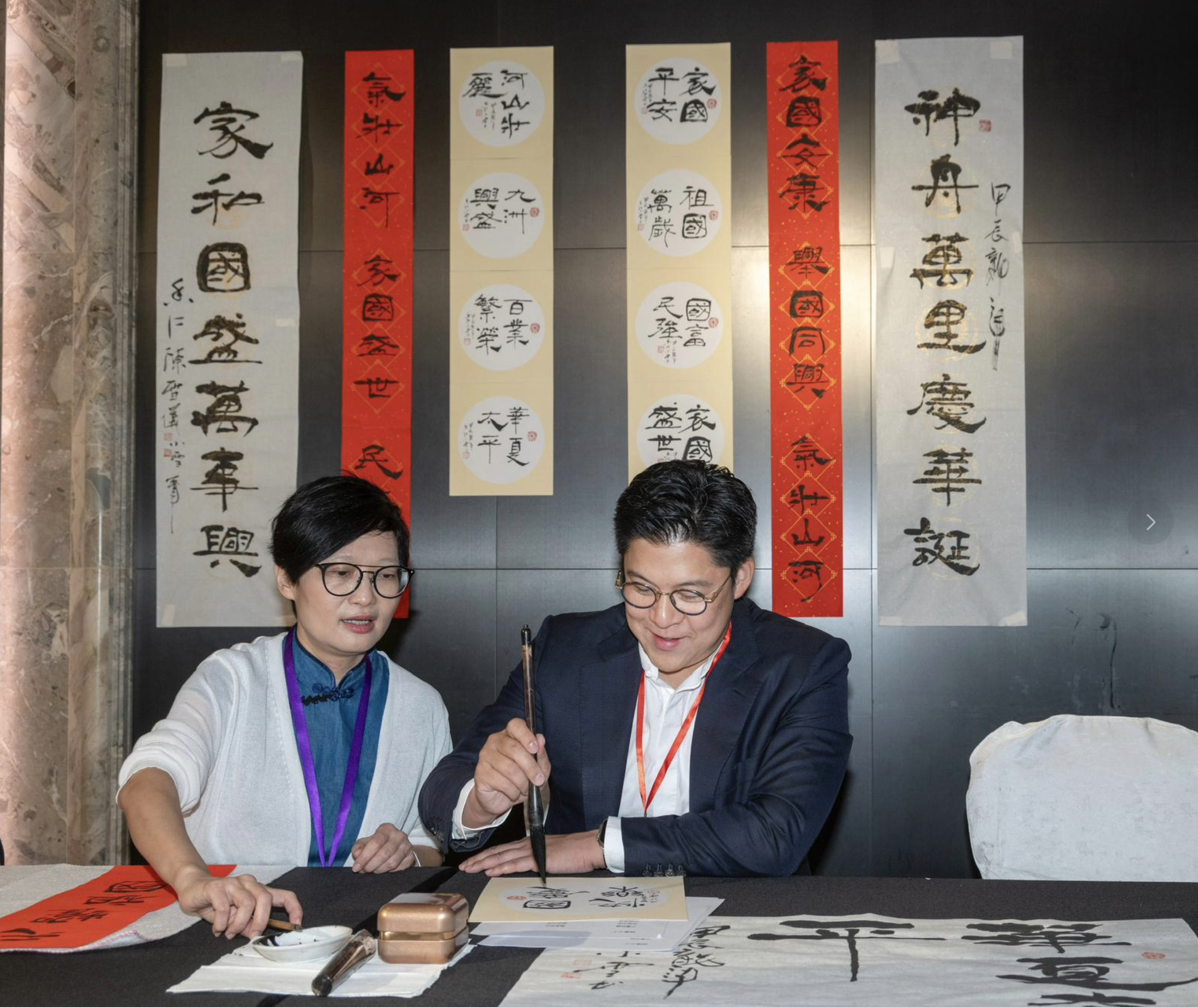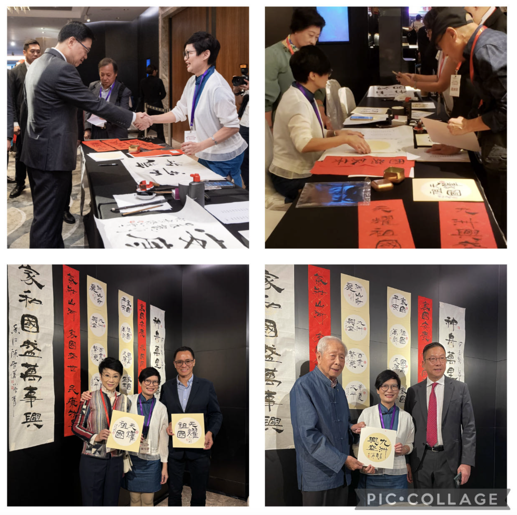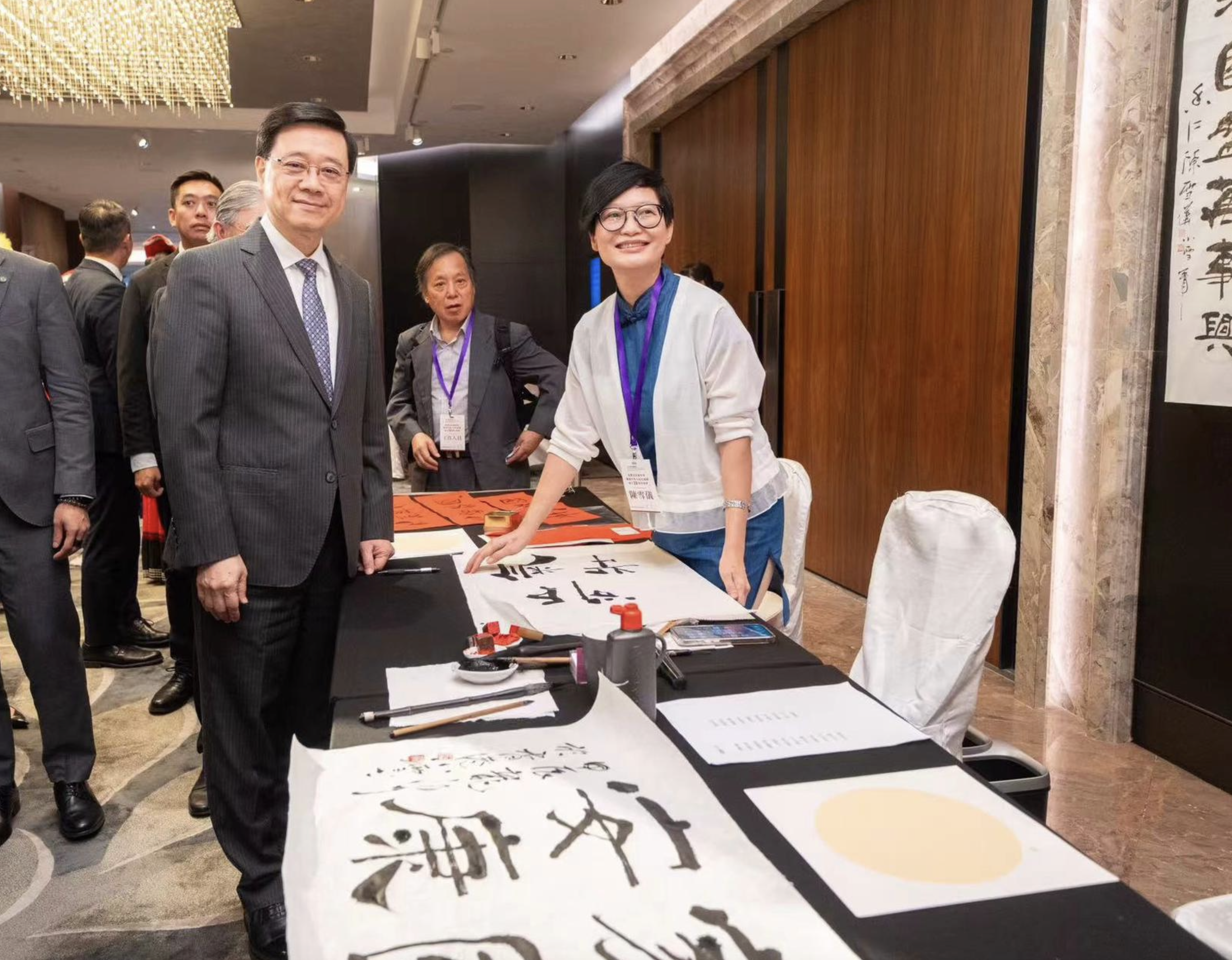 今年大會更設有藝術示範及表演的攤位,其中邀請筆者進行示範書法工作坊,在儀式開始前,主禮嘉賓李家超特首前來欣賞各攤位,且對書法藝術表示欣賞,令人欣喜。另外,香港藝術發展局主席、籌委會秘書長霍啟剛先生也來到筆者的攤位進行書法體驗,他用心研究中國書法的執筆、運筆等巧妙之處,很快就了解道中國書法藝術的特色,且十分支持推廣中國書法文化。