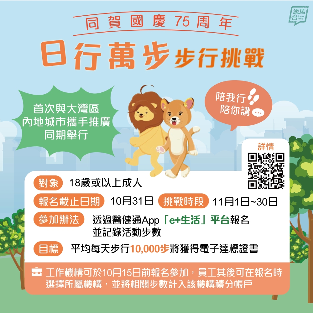 「日行萬步」步行挑戰活動現正接受報名,參加者可透過醫健通流動應用程式登錄「e+生活」平台報名,並於11月接受挑戰。除了個人報名外,亦包括工作機構的步行挑戰,鼓勵朋友和同事之間互相支持,每天步行10,000步。看圖了解詳情。