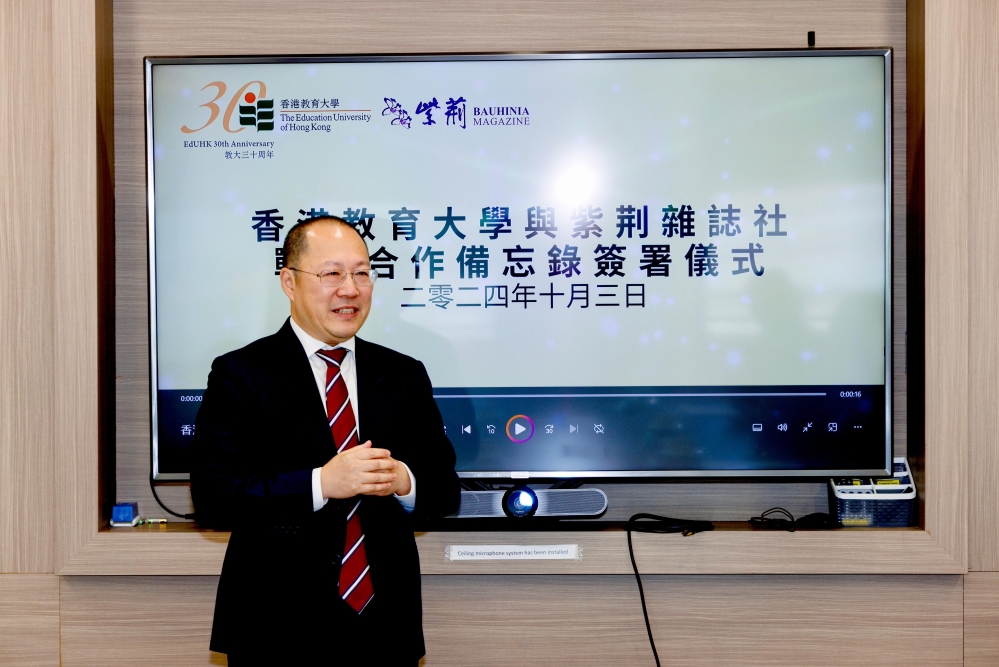 李子建教授在致歡迎辭時指出,香港教育大學一直肩負著培養教師及各類人才、推動科研創新及教育實踐的使命,而紫荊雜誌社作為香港具有高度權威性、專業性和知識性的媒體機構,為香港與內地的相互瞭解與交流合作搭建了重要的橋樑。他說,教大與紫荊雜誌社的合作,旨在通過教育、文化及媒體的力量,共同推動青年人的價值觀教育、愛國主義教育,以及中華傳統文化傳承。我們致力於培養德才兼備且具有國際視野青年一代的目標是高度一致的,這為雙方的全方位合作提供了廣闊前景。
