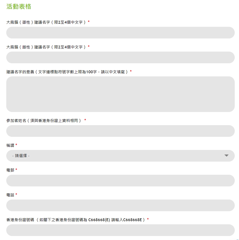 ② 為兩隻大熊貓分別提議一個中文名字,及以不多於100字解釋建議名字的意義;至於大熊貓的英文名字,當局會按普通話拼音訂出
