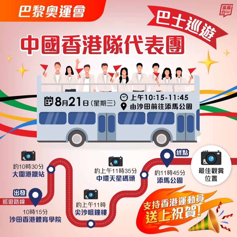 中國香港代表團在巴黎奧運會取得歷史佳績,運動員、教練及其他代表團成員將於星期三(8月21日)上午參與巴士巡遊,乘坐兩輛開篷巴士由沙田前往添馬公園,讓市民一睹風采。立即看圖記下巡遊路線及最佳觀賞位置,到現場向他們送上祝賀。