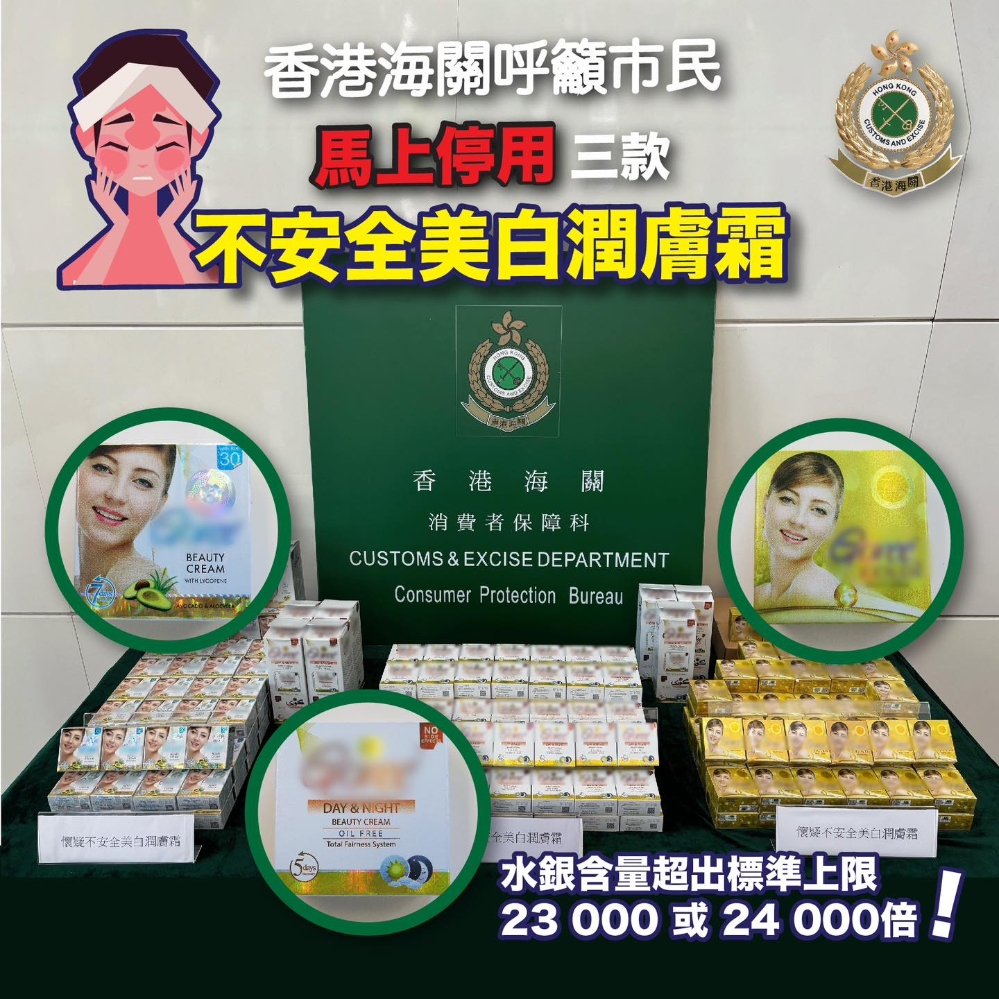 香港海關早前接獲相關部門轉介一宗涉及病人使用一款美白潤膚霜後水銀中毒的個案。測試證實該款美白潤膚霜所含水銀成分達百萬分之23 000。其後,香港海關發現同一品牌的另外兩款美白潤膚霜的水銀成分均達百萬分之24 000。根據相關化妝品衞生標準,該三款美白潤膚霜的水銀含量分別超出標準上限23 000倍、24 000倍及24 000倍,涉嫌違反《消費品安全條例》(《條例》)。