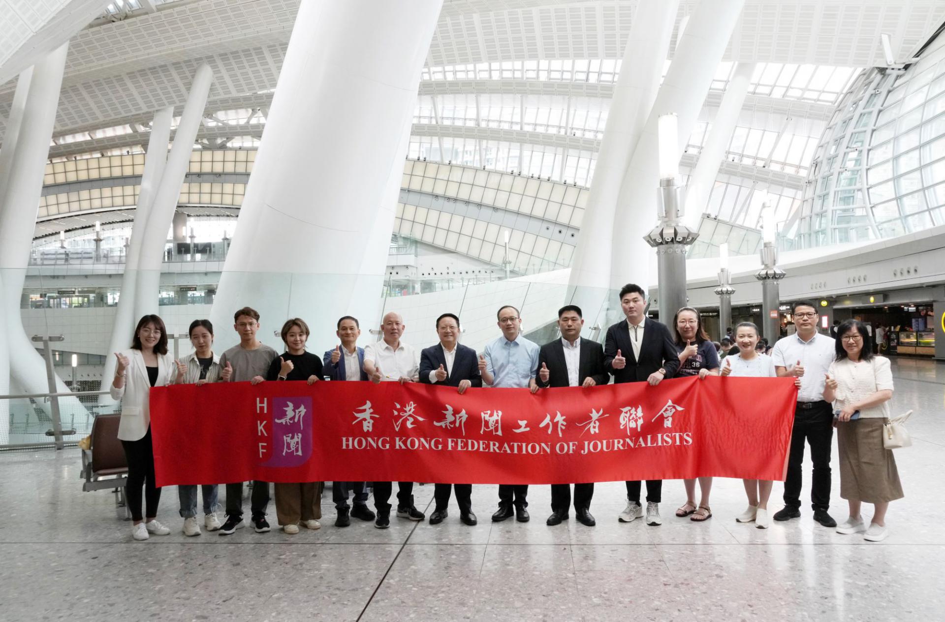 6月23日下午, “同心築夢 共謀發展”粵港澳媒體走進大灣區聯合採訪活動,在香港西九龍高鐵站舉行啟程儀式。香港新聞聯主席李大宏、中央政府駐港聯絡辦宣文部副部長林枬等,為參加大灣區聯合採訪的香港媒體代表授旗壯行。