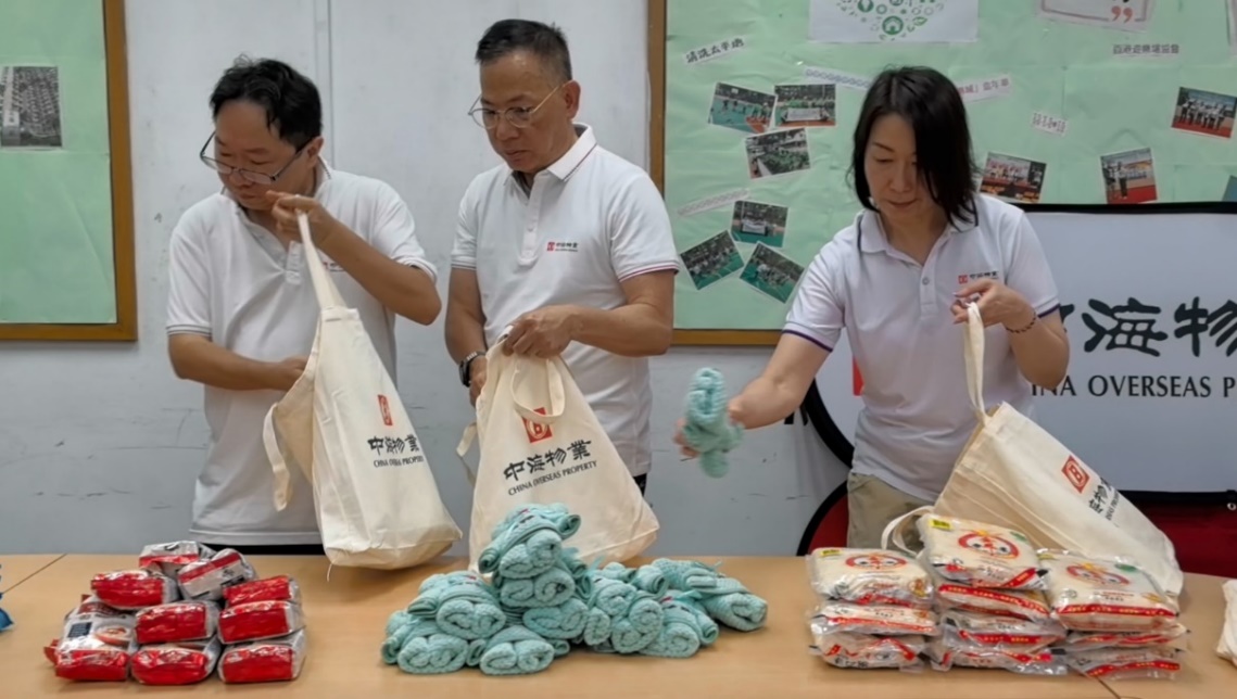 活動開始之前,義工們分工合作,將精美的公仔毛巾,以及米麵、燕麥、紙巾、酒精搓手液、便攜環保餐具等豐富生活物資,裝入即將派贈的“中海愛心禮包”,等著稍後將這些生活用品送去長者家中。
