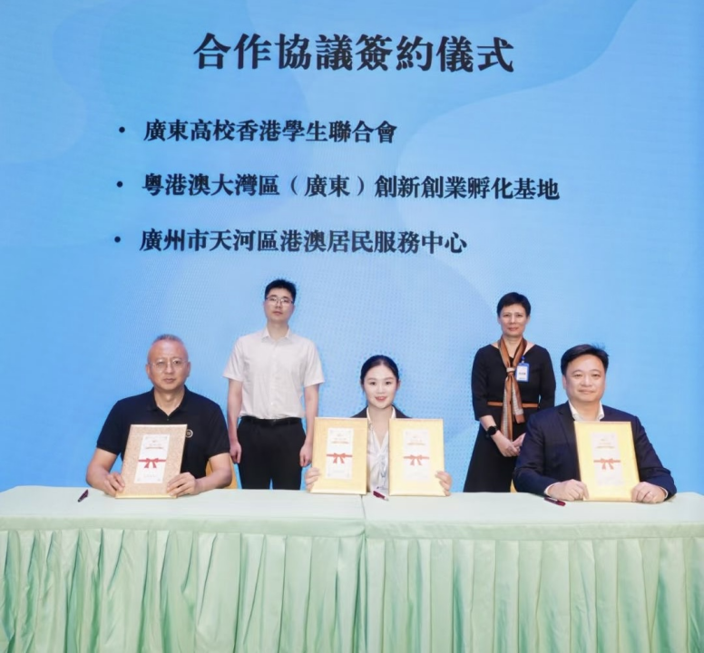 現場舉行廣東高校香港學生聯合會、粵港澳大灣區(廣東)創新創業孵化基地、廣州市天河區港澳居民服務中心合作協議簽約儀式。
