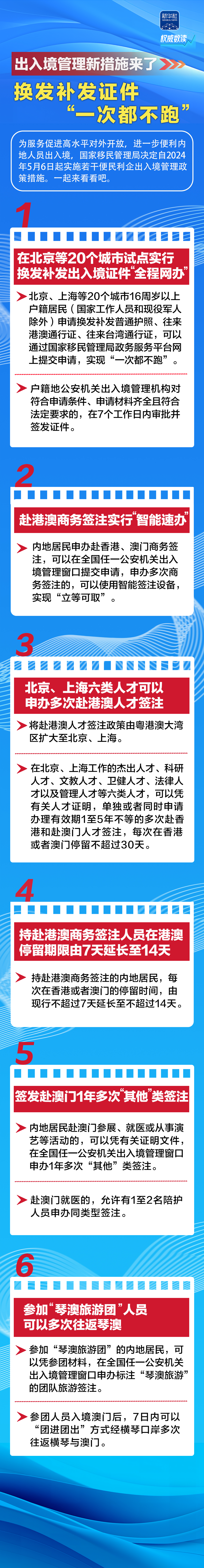 為服務促進高水平對外開放,進一步便利內地人員出入境,國家移民管理局決定自2024年5月6日起實施若干便民利企出入境管理政策措施。一起來看看吧。