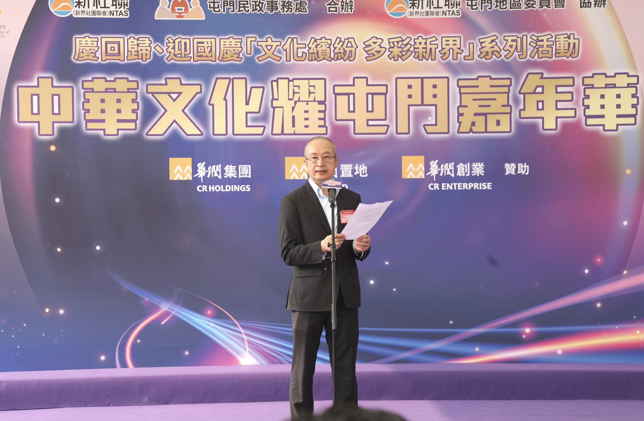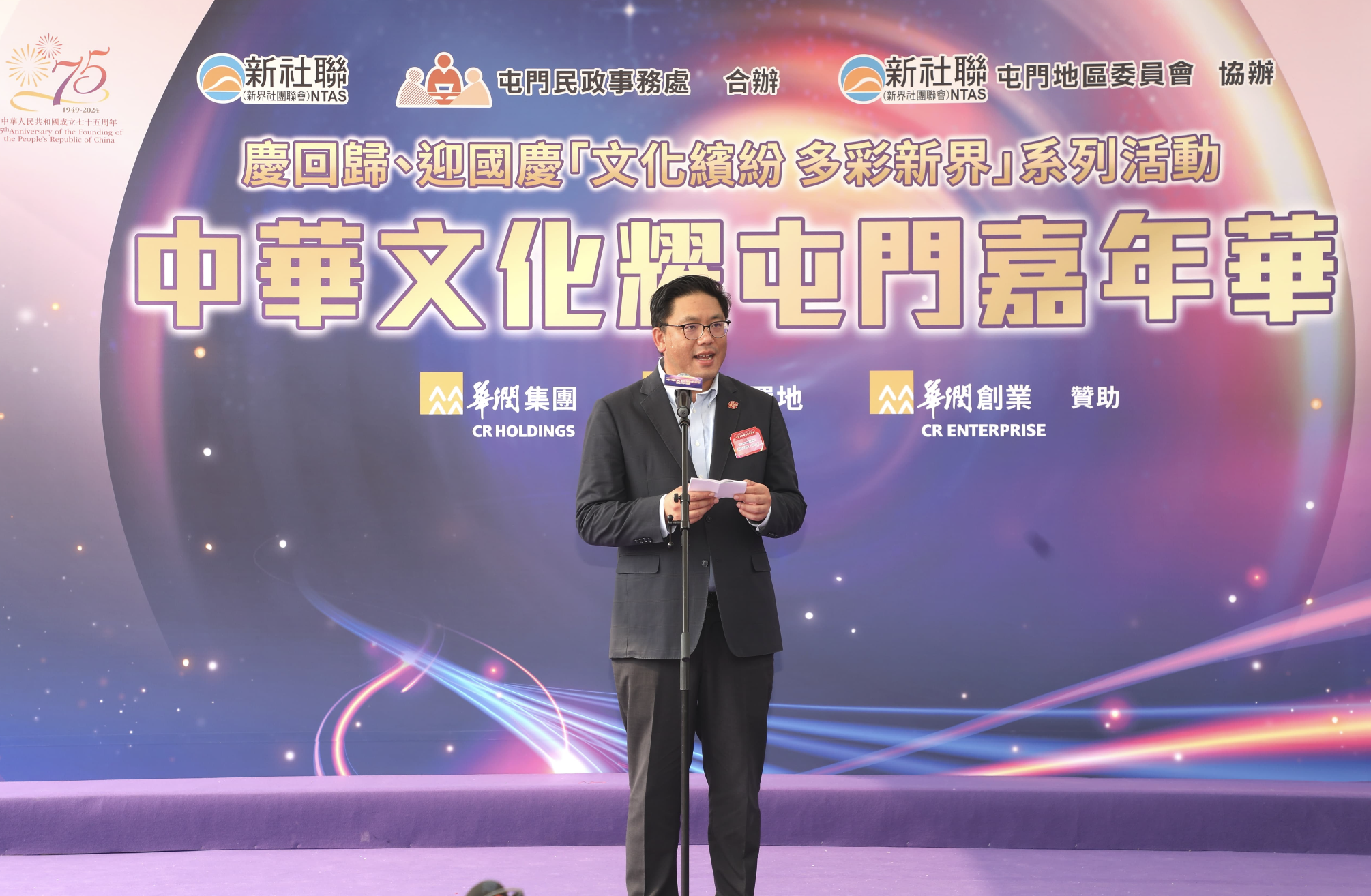 新界社團聯會、屯門民政事務處聯合主辦、新界社團聯會屯門地區委員會協辦的慶回歸、迎國慶“文化繽紛、多彩新界”系列活動之“中華文化耀屯門嘉年華”於2024年9月28日在屯門文娛廣場順利舉行,中央政府駐港聯絡辦新界工作部部長李薊貽,民政及青年事務局副局長梁宏正,行政會議成員、新界鄉議局主席劉業強,屯門警區指揮官吳國章總警司,華潤集團職工聯誼會執行副會長石永剛等蒞臨主禮,屯門民政事務專員關可臨,港區全國人大代表召集人、新界社團聯會會長陳勇,新界社團聯會理事長譚鎮國,新界社團聯會屯門地區委員會主席雲天壯以及屯門區議員、三會成員等逾百人出席共慶。