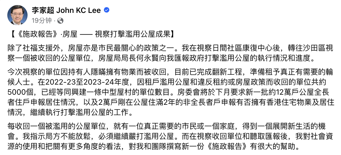 每收回一個被濫用的公屋單位,就有一位真正需要的市民或一個家庭,得到一個展開新生活的機會。我指示局方不能放鬆,必須繼續嚴打濫用公屋。而在視察收回單位和聽取匯報後,我對社會資源的使用和把關有更多角度的看法,對我和團隊撰寫新一份《施政報告》有很大的幫助。