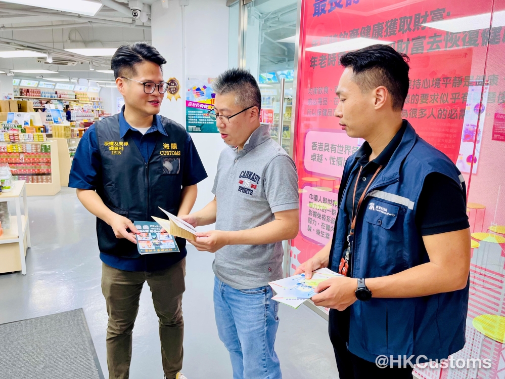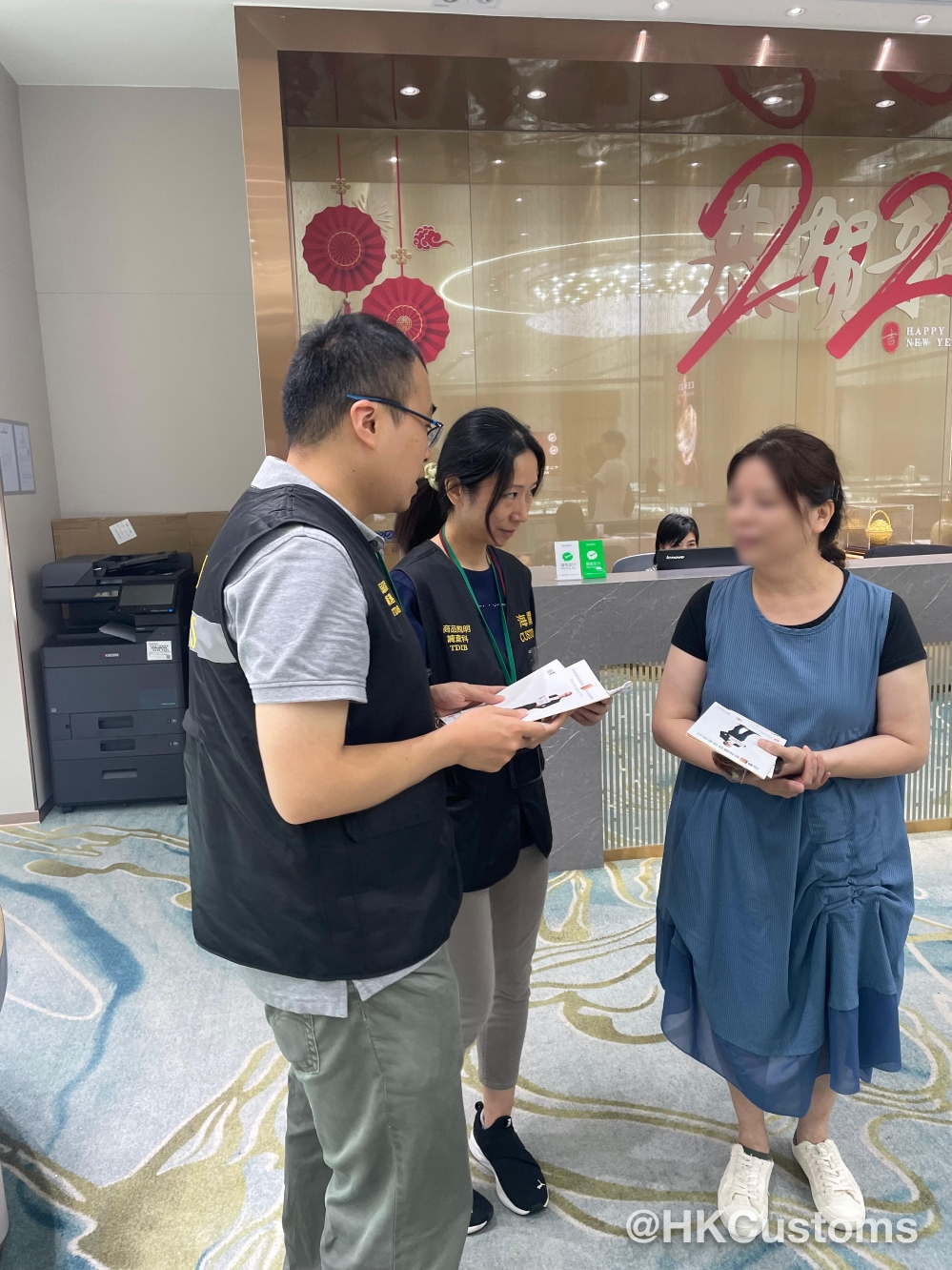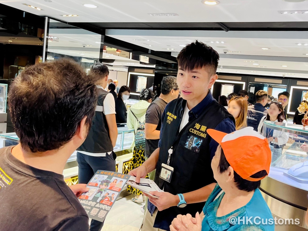 為提醒訪港旅客於購物時提防受騙,香港海關人員派發宣傳單張及講解購物前要留意商品的價錢單位等消費小貼士,以免墮入消費陷阱。