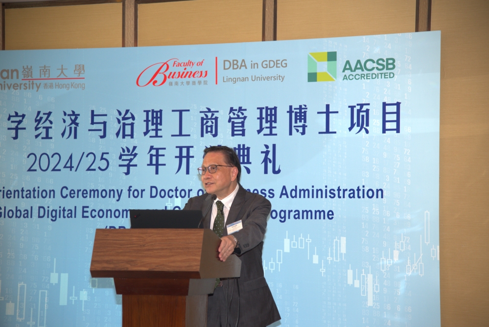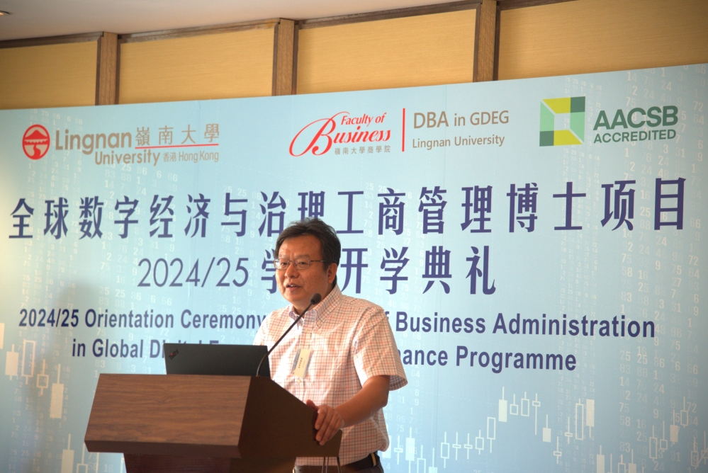 隨後,商學院院長冷明明教授發表了一段振奮人心的演講。冷院長首先介紹了DBA項目的基本情況,在課程設計上,項目分別從宏觀、中觀以及微觀三個方面深度切入,幫助同學從不同維度對數字經濟與治理進行深入學習。冷院長也和同學們分享了嶺南大學商學院近期取得的成就,作為最早一批獲得AACSB認證的商學院,嶺南大學科研上取得了輝煌的成就。不久前嶺南大學商學院再次榮獲Beta Gamma Sigma(BGS)頒發的2023/24學年“Highest Honors Chapter”榮譽,這一殊榮標誌着嶺南大學商學院在全球商學院中的卓越地位。在最新公布的UTD全球商學院科研排名百強榜單中,嶺南大學憑藉卓越的科研實力和國際影響力,成功入選並位列中國商學院科研排名百強榜第24位。最後,冷院長亦勉勵新同學,希望大家在DBA課程學習中能夠集中精力,努力地和項目組同事保持良好的溝通,努力地和導師們保持良好的協作,順利地完成學業。