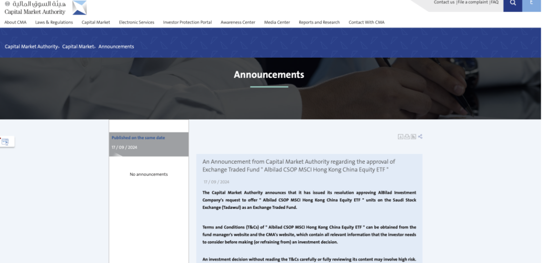 沙特資本市場管理局日前在官網宣布,已批准一隻投資中國香港上市股票的ETF。該ETF由阿爾比拉德銀行(Bank Albilad)的證券部門阿爾比拉德資本(Albilad Capital)管理,ETF追蹤中國香港股票指數,擬於沙特交易所上市。資本市場管理局(CMA)為沙特的資本市場監管機構。