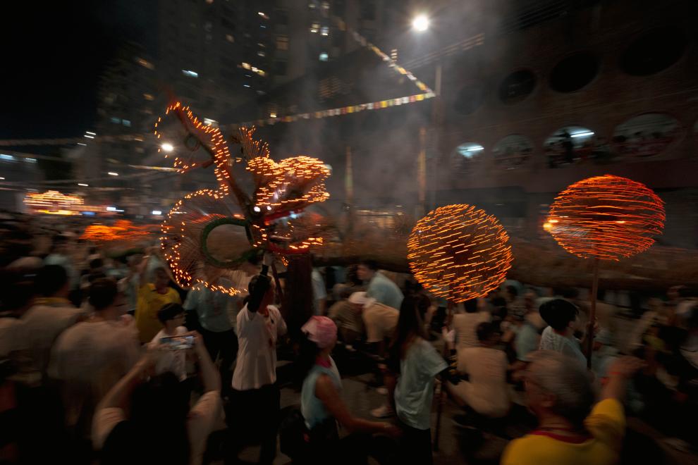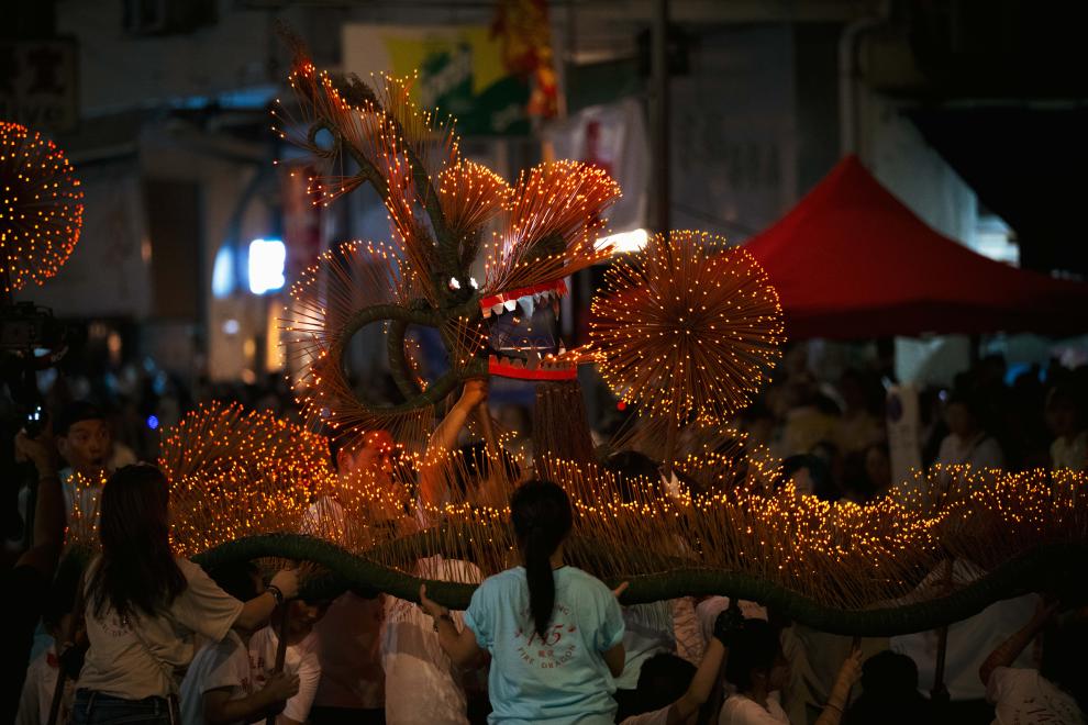 月光下,一條由竹子、藤條、麻繩和珍珠草等材料捆紮而成的龍,身上插滿燃燒的香枝,伺機而動。隨着“咚鏘、咚鏘”鑼鼓聲響,火龍在約300名隊員的合力下從安庶庇街“衝”出人群,現場歡呼聲不斷……在香港大坑,有着百余年歷史的傳統民俗活動“大坑舞火龍”16日起一連三日上演,為全城增添節日氣氛。