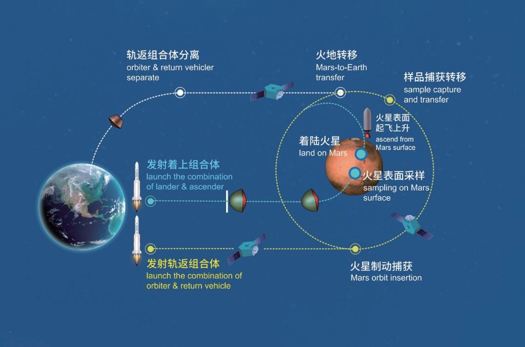 地月距離約38萬公裡,而地球與火星的平均距離約4億公里。“火星比月球距離遠得多,環境也更加複雜。”劉繼忠介紹,受限於目前火箭的運載能力,原先通過一次發射實現月球取樣,但在火星取樣任務則需要兩次發射。中國計劃2028年在海南文昌用40天左右的時間,使用兩枚長征五號運載火箭,分兩次發射天問三號的軌道器、返回器組合體和着陸器、上升器組合體。