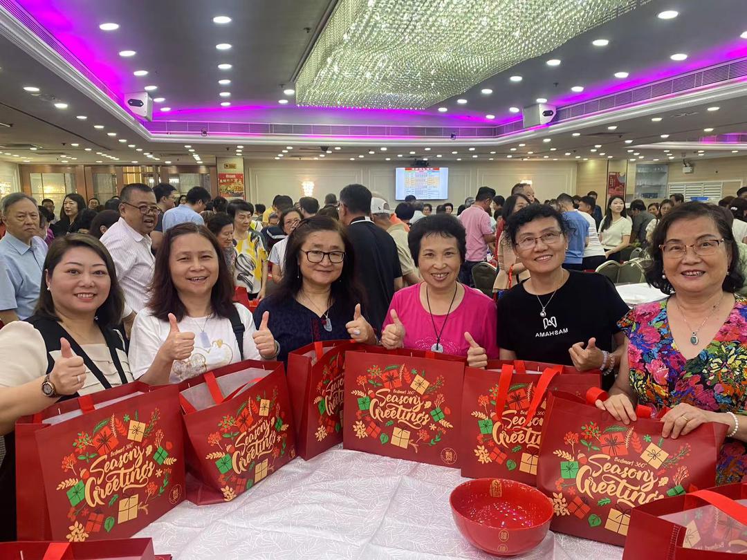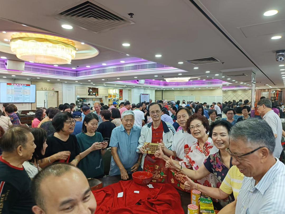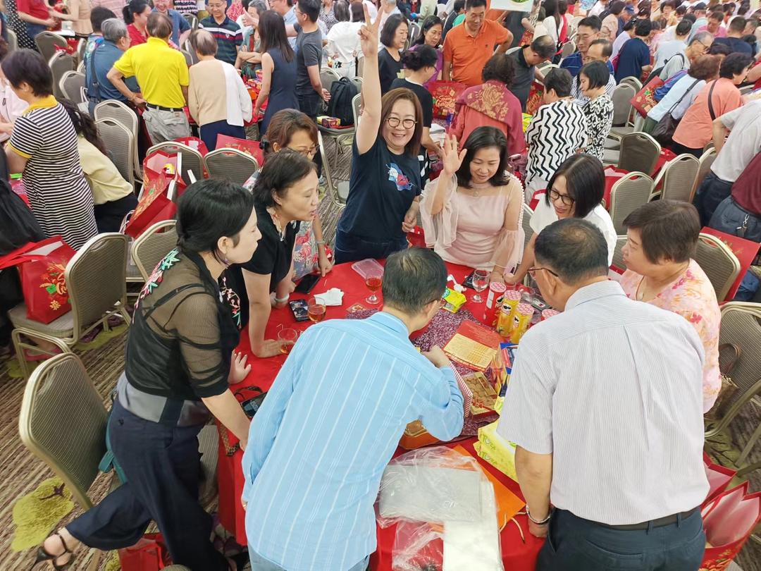 在開心的氛圍中,與會賓主齊齊博餅。 眾人撒下的骰子徐徐落下,此起彼伏地发出叮当清脆響聲,現場歡聲笑语和溫馨的鄉情洋溢,人人樂融融 ,齊博好兆頭。