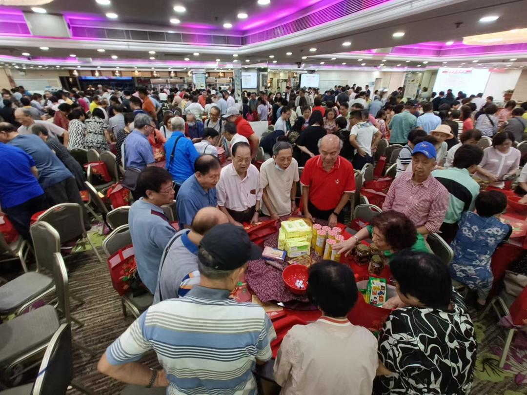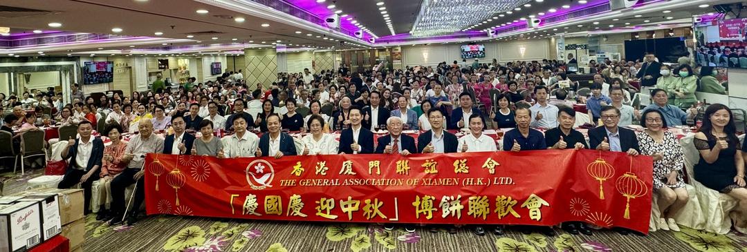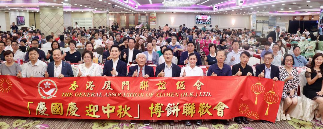 香港廈門聯誼總會3 日在北角富港酒樓舉辦“ 慶國慶 迎中秋”“搏餅”聯歡晚會。該會理事長李冠華,永遠榮譽會長陳榮旋、王少華、蔡瑞義,副理事長兼秘書長李毅立, 香港福建社團聯會榮譽顧問林廣兆 ,副主席兼秘書長佘德聰,香港福建社團聯會港島東分會執行會長柯文華,香港島各介聯合會北鰂地委會主席李莉 ,東區警署警長史明麗,南方影業總經理林雲華,漳龍實業副總經理黃軍英, 香港福建社團聯會常務副秘書長兼總幹事周珊珊等與廈聯會會員鄉親逾500人參加了活動。 與會賓主在廈門傳統習俗活動—中秋“搏餅”歡樂聲中和會員歡歌熱舞中 ,同慶偉大祖國成立75 周年, 共迎傳統中秋佳節。