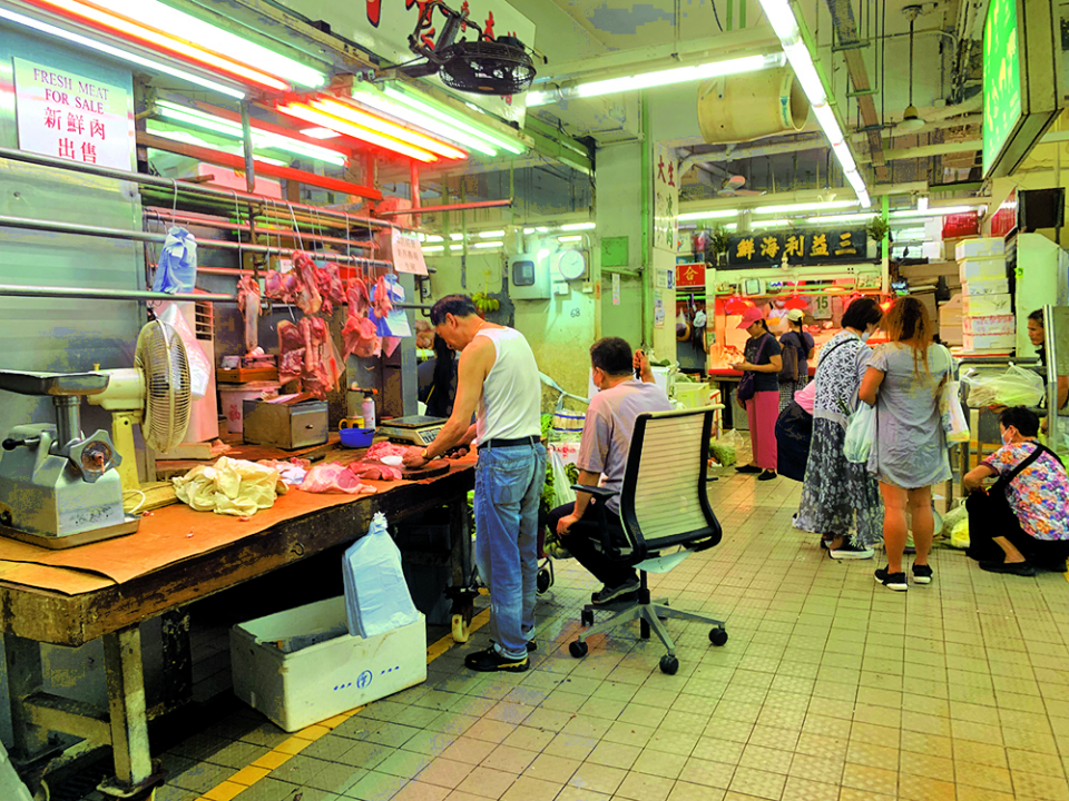 回想燈籠洲街市落成初期,設有過百攤檔,一度雞鴨魚肉蔬果齊全。時至今日,除了一樓全層空置至今14年,地下場內也十室九空,只有幾檔菜檔、肉檔,以及兩檔魚檔(鮮魚和冰鮮魚)苟延殘喘。面對街市凋零、生意大不如前,梁惠康則抱著既來之則安之的心態面對,“做得一日得一日!”