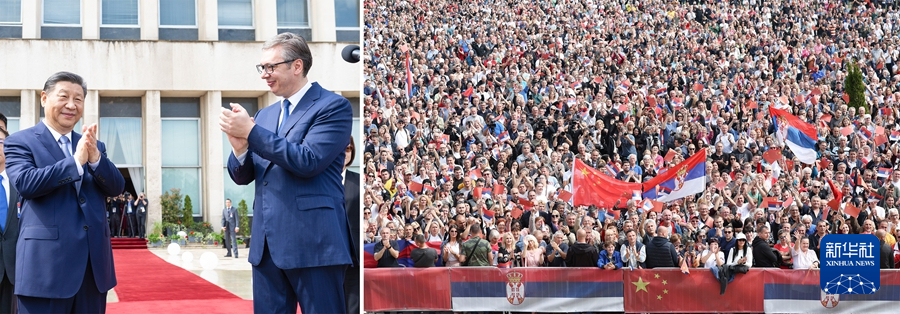 會談前,塞爾維亞總統武契奇陪同習近平主席來到大廈平台。此時,平台外的大廈廣場上,友誼的海洋沸騰起來——一萬五千名當地民眾揮舞中塞兩國國旗,齊聲呼喊兩國國名,對遠道而來的貴客表示最熱烈的歡迎。