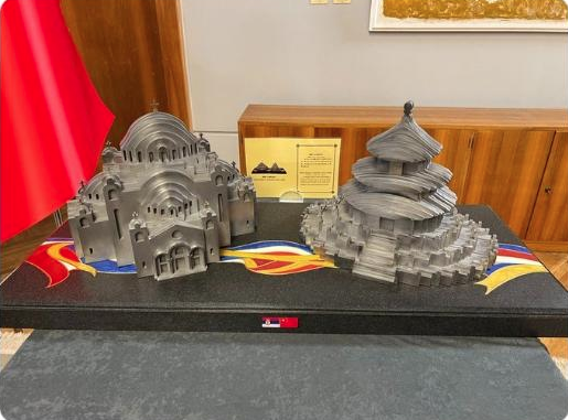 習近平主席送給武契奇兩件工藝品,分別是鋼材質的天壇和聖薩瓦教堂造型。