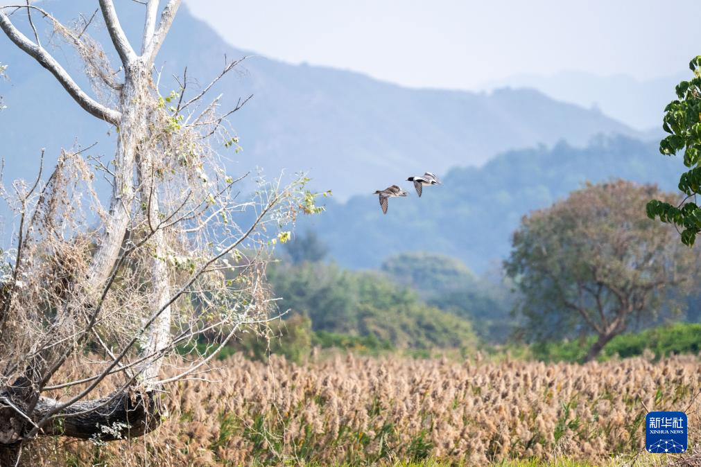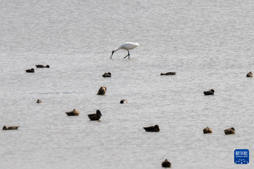 一群鸕鶿彎着脖子在高高的樹上停棲,一對白鷺舒展翅膀優雅地從半空掠過,數百只赤頸鴨在水塘裡嬉戲遊弋,幾隻黑臉琵鷺涉水行走,不時將扁嘴扎入水中覓食。