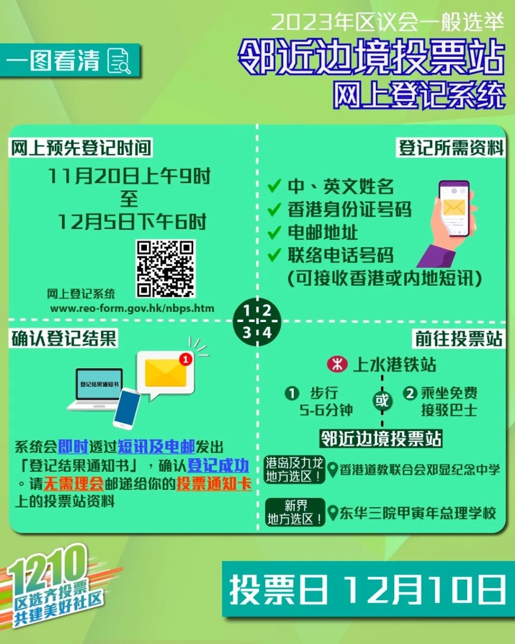 為了便利在內地工作和生活的港人返港投票,履行公民義務,特區政府為44個區議會地方選區的選民,在上水港鐵站附近的兩所學校設立了“鄰近邊境投票站”。選擇“鄰近邊境投票站”的選民必須預先在網上登記,登記期明日(12月5日)下午六時結束。鄭偉源呼籲選擇“鄰近邊境投票站”的內地港人應立即登記,以免錯失機會。