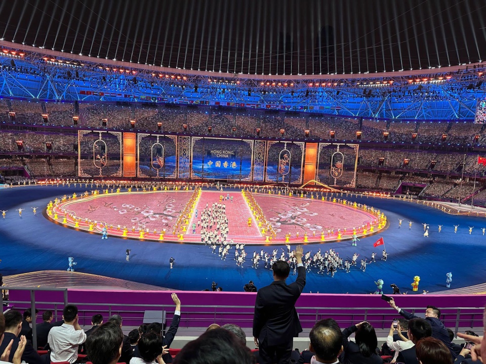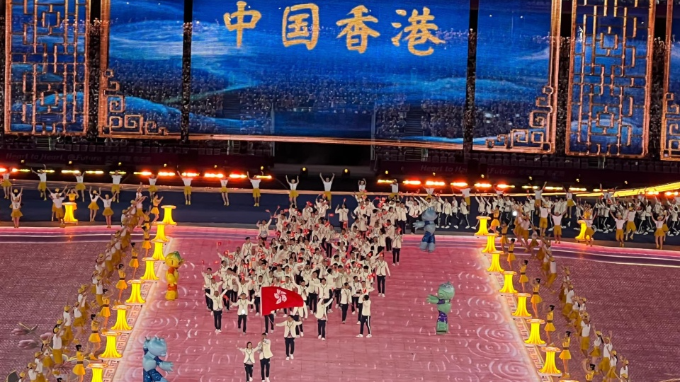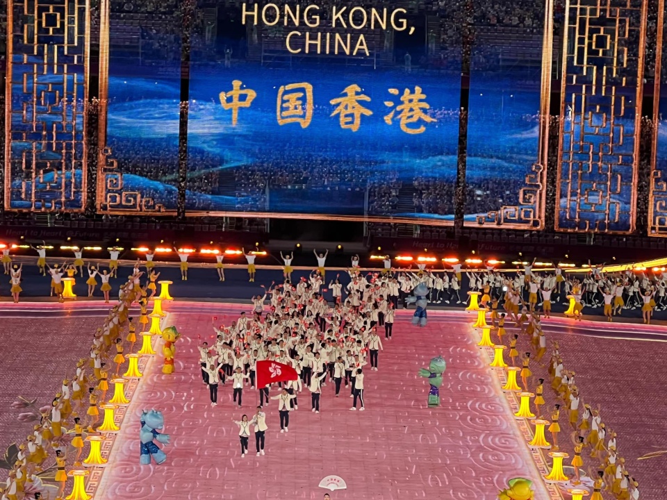 第19屆亞運會今晚8點在杭州奧體中心開幕。在升國旗、奏國歌之後,亞洲各個國家和地區代表團入場。中國香港代表隊由武術代表莫宛螢及七人欖球代表姚錦成出任持旗手,入場獲得了觀眾們的熱烈歡呼。