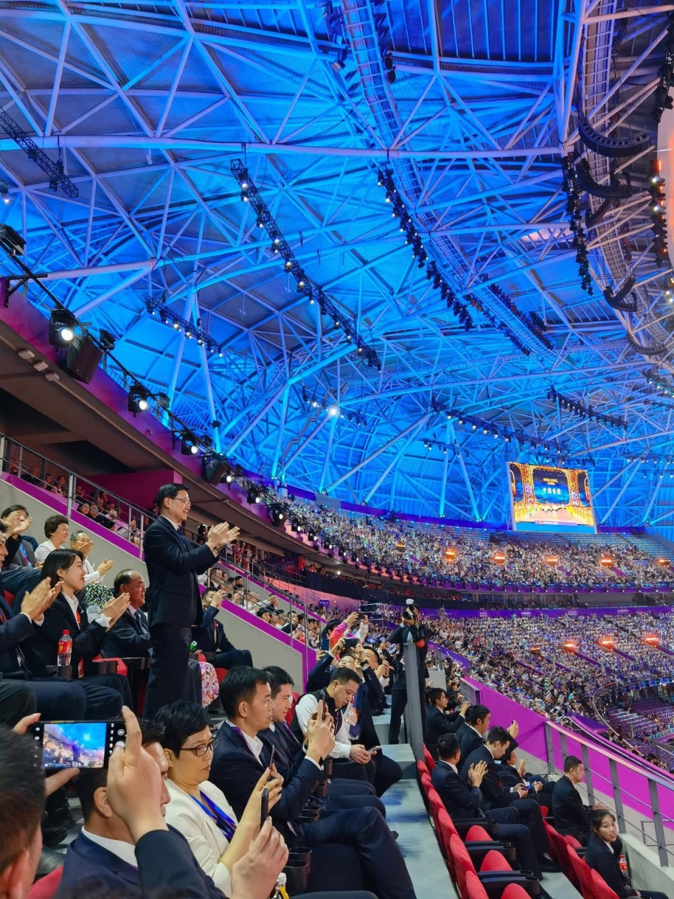行政長官李家超今日親臨現場,為隊員們打氣。他在觀眾席上向隊員們揮手致意,還在社交媒體發文表示,“讓我們一起為香港隊歡呼打氣!衷心祝願杭州亞運取得巨大成功,各位運動員在比賽中發揮出最佳水平,為自己創造最佳成績!”