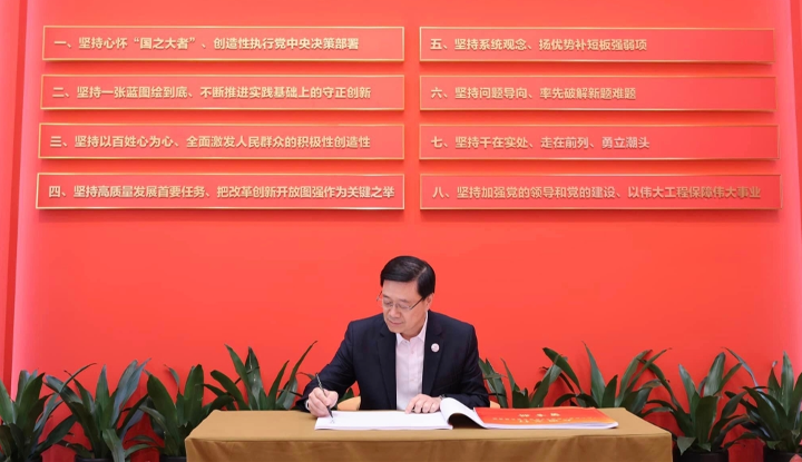 今日(23日)下午,香港特區行政長官李家超在浙江展覽館觀看了“大道之行——‘八八戰略’實施20周年大型主題展覽”。