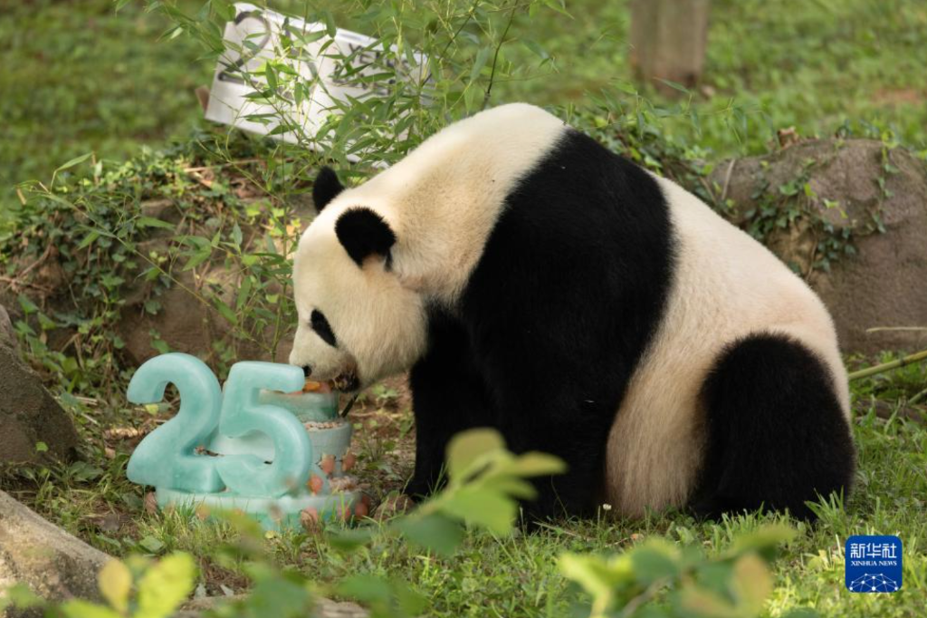 當天上午9時,該動物園工作人員為“美香”送上營養部門精心設計和製作的蛋糕,由冷凍稀釋蘋果汁製成的數字“25”十分醒目,蛋糕上還有紅薯泥、胡蘿蔔泥、蘋果切片和竹子等。