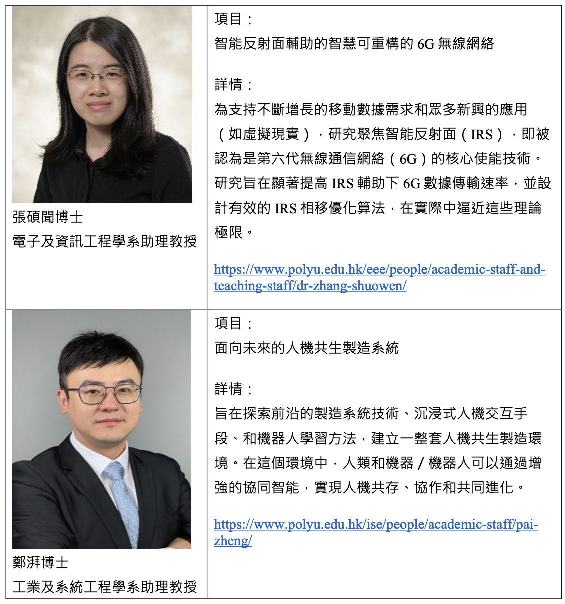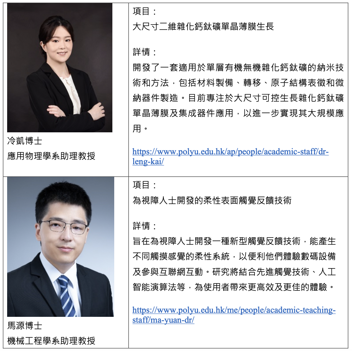 今年獲獎的六位研究人員科研項目涵蓋多個領域,包括可再生綠色能源、可穿戴醫療康復設備、納米技術、輔助視力障礙者的軟材料、人機協作制造系統和信息網絡。