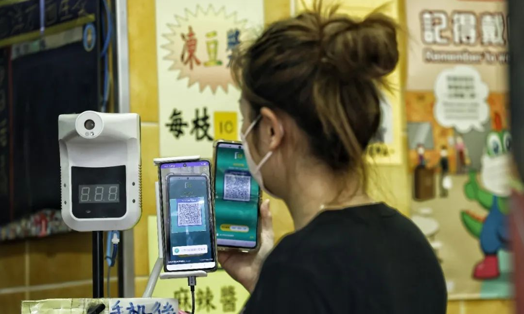 香港在今年2月實施疫苗通行證,市民進去餐廳等,首先必須掃描門口的“安心出行”,讓市民掌握自己是否去過高風險場所;隨後還要讓餐廳員工掃描電子針卡,才能保證入座。