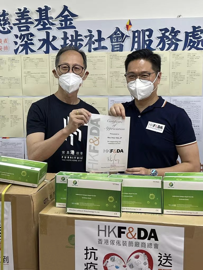4月15日,香港傢俬裝飾廠商總會舉行傢俱行業“抗疫送暖”送贈行動,立法會(批發及零售界)議員邵家輝亦有出席,協助商會代表將一批抗疫物資送贈給宏施慈善基金深水埗社會服務處,包括口罩、面罩及檢測包等。
